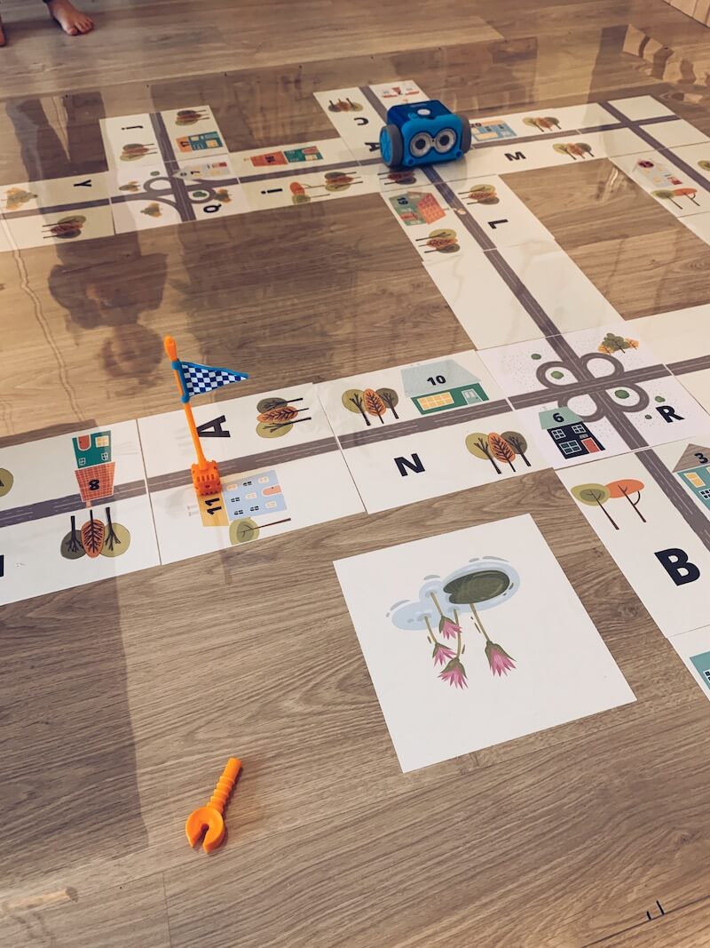 Op de mat staan letters en cijfers. Er zijn superveel mogelijkheden om deze mat te gebruiken, zelfs zonder B-bot. Spelsuggesties en speelkaarten kan je hieronder bij de gratis printable vinden. Druk ze af in kleur en lamineer.