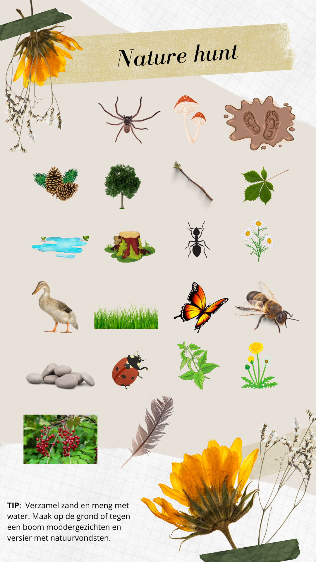 Zodra het mooi weer is, vind je ons dan ook in de tuin, het bos of het park. Met deze natuurbingo toveren we een wandeling om tot een waar avontuur. Download het sjabloon voor jou en je vrienden. Organiseer een spannende speurtocht en ga op zoek naar vlinders, bloemen en paddenstoelen. Kruis jij als eerste een volledige rij met vakjes aan? Roep dan BINGO! Veel succes!