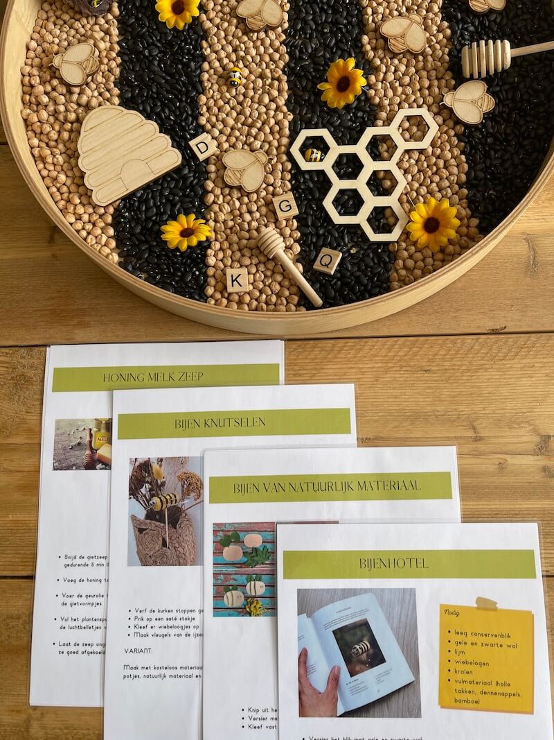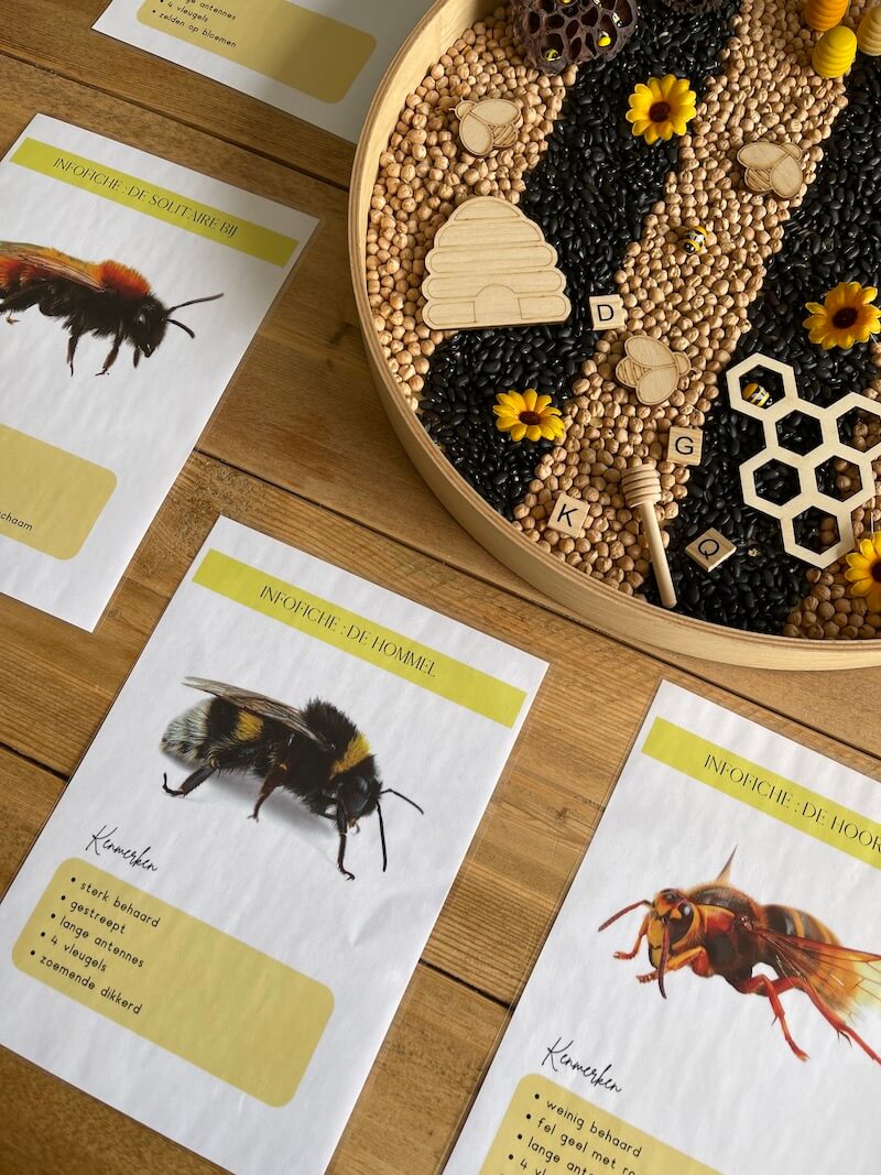 Ook kan je een ontdektafel rond bijen opzetten. Met gekleurde rijst, telstenen en meer. Tellen en taal met bijen. Kinderen ontdekken meer op een laagdrempelige manier.