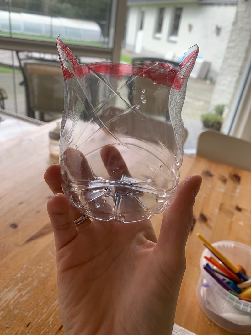 - teken een figuur op je plastiek fles en knip of snij deze uit.