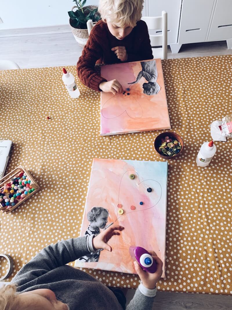 Ze vinden het géweldig om zelf te kleven en het maakt op zich niet zoveel uit dat ze veel lijm gebruiken, want het droogt doorzichtig op. Wel opletten dat je de canvassen neerlegt en zo laat drogen. Wij hebben ze jammer genoeg iets te vlug rechtop gezet en zo is de lijm naar onderen gedrupt en werden de lijnen van het hartje ook uitgevaagd waardoor ik met dikkere stift rond te lijnen ging en het was eigenlijk mooier met dunnere lijnen. Maar hey, ze hebben het zelf gemaakt en oma en opa vonden het MEGA mooi!!!!