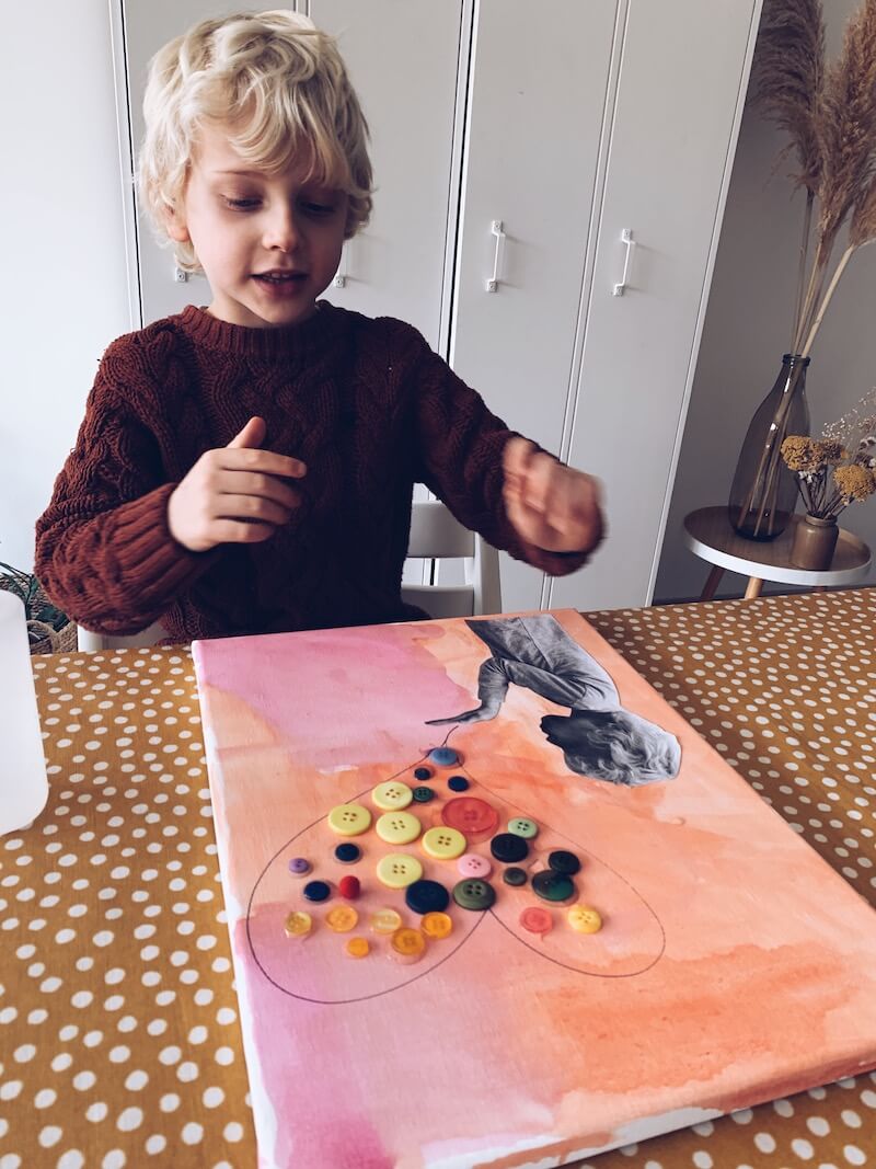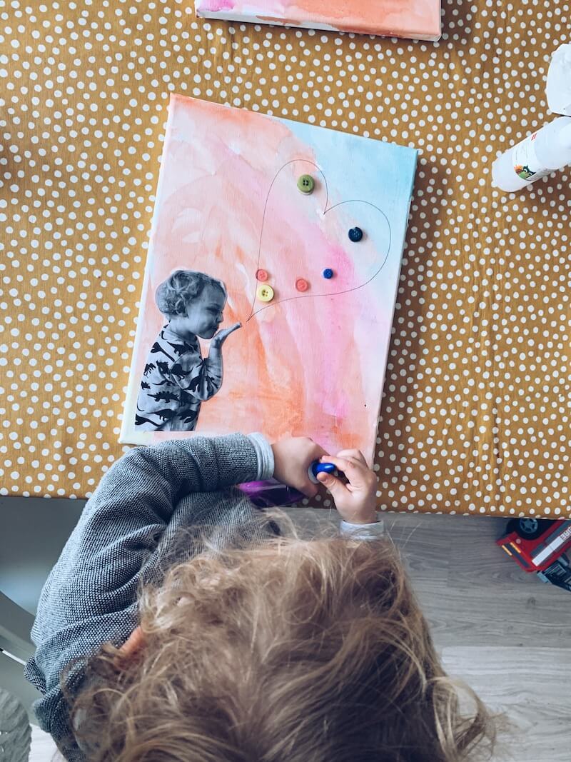 Ondertussen trok ik van hen een foto waarop ze iets wegbliezen. Ik drukte de foto af in het zwart-wit en knipte hen uit. Die foto kon op het schilderij gekleefd worden. Wanneer je kinderen al wat ouder zijn kunnen ze zichzelf natuurlijk best uitknippen,. Ik vroeg hen wat we gingen wegblazen en dat werd een hart. Ik tekende dt voor hen en ze mochten het zelf opvullen. We gebruikten verschillende soorten knoopjes.