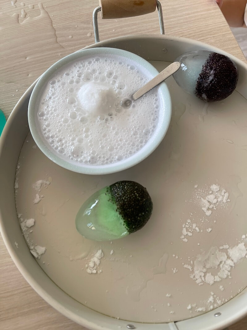 Zijn je kinderen gek op dino’s? Wel, maak dan eens een ontdektafel in thema dino’s en leg er chia ijseieren bij. Je maakt deze door chia slijm te maken en plastic eieren te vullen voor de helft met chia slijm en de andere helft met water. Leg ze een nachtje in de vriezer en klaar. Je kan ook echte lege eieren gebruiken die je uitgeblazen hebt.