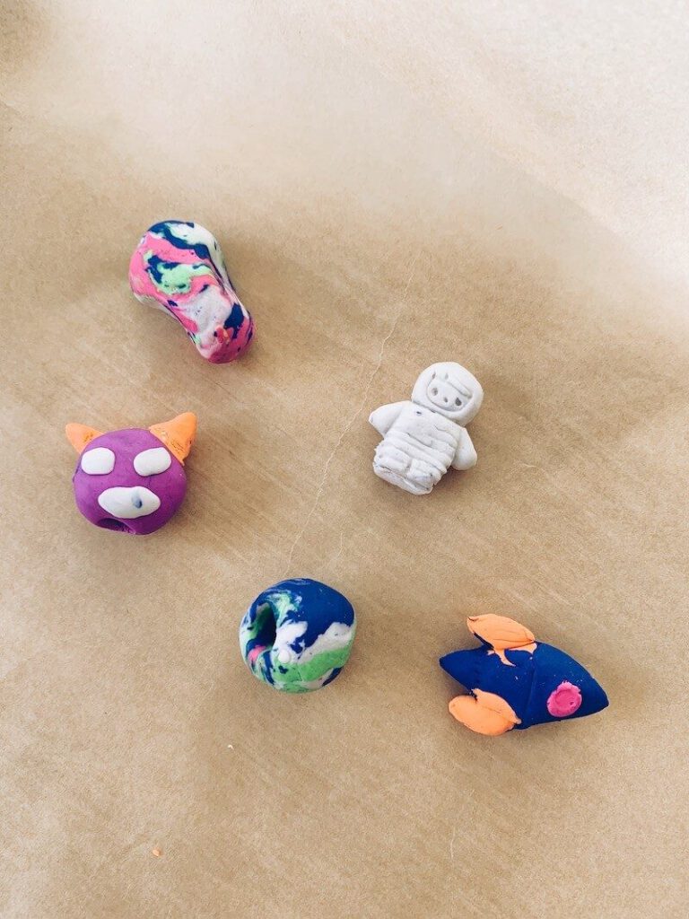 Zelf gom maken kan je dus met Patagom. Dat zijn verschillende kleurtjes ‘gom’ die je kunt kneden en waarmee je leuke figuurtjes kunt maken. Je moet wel een tijdje kneden zodat het warmer wordt in je handen en je er beter mee kunt werken. Doe je dat niet, dan brokkelt het een beetje. Je kan ook met bijbehorende malletjes figuurtjes maken. Het werkt super eenvoudig, net zoals klei. Wij maakten verschillende figuurtjes en ook een wereldbol met de overschot van de stukjes die we hadden weggesneden. Wil je de gummetjes achteraan het potlood bevestigen dan maak je voor het ‘bakken’ in de oven een gaatje met het potlood.