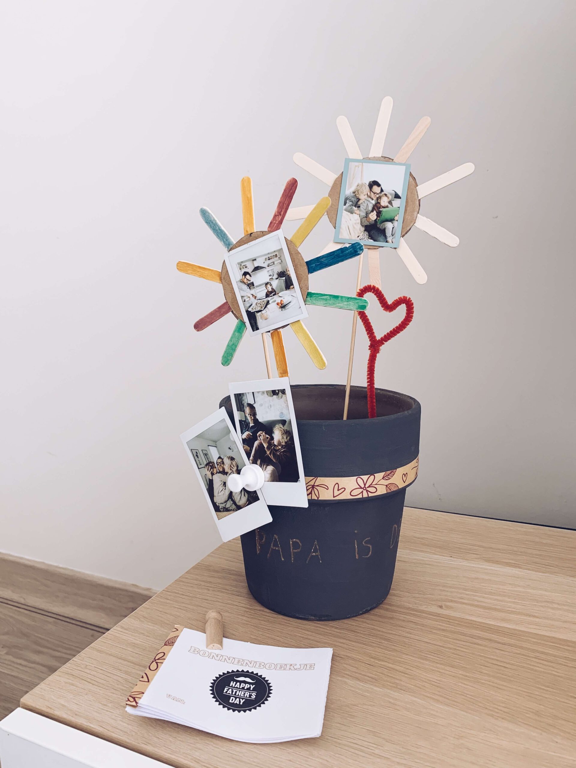 Net zoals bij puntje twee een optie om een bloempot eerst te versieren: schilderen, decopatchen, er mozaïeken op doen, met krijtbordverf beschilderen enz… Je kan er een zakje met zaadjes of bloembollen bijsteken en eventueel een zelfgemaakte bloem met als boodschap; bedankt om me te laten groeien en voilà, daar heb je duurzame geschenkjes! Wij maakten onderstaande bloempot voor vaderdag met printables, maar je kan dit dus ook maken als duurzaam leerkrachtengeschenk.