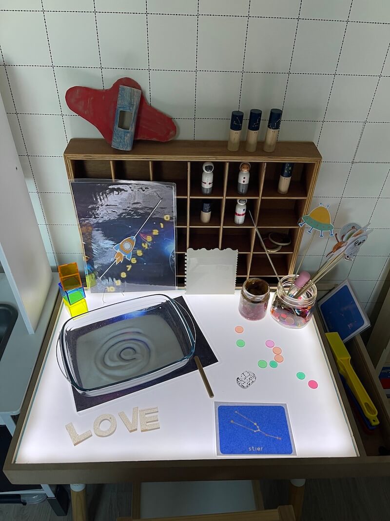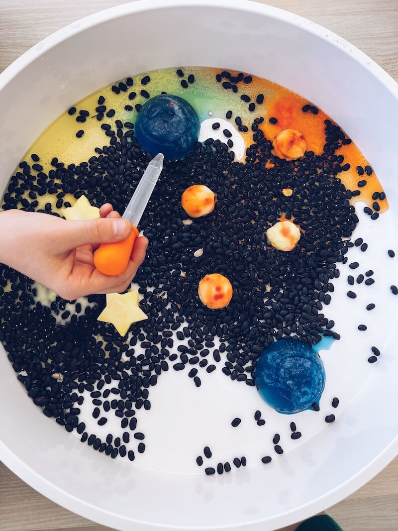 Hier vind je een idee voor het aanbieden van sensory play in het thema ‘de ruimte’.