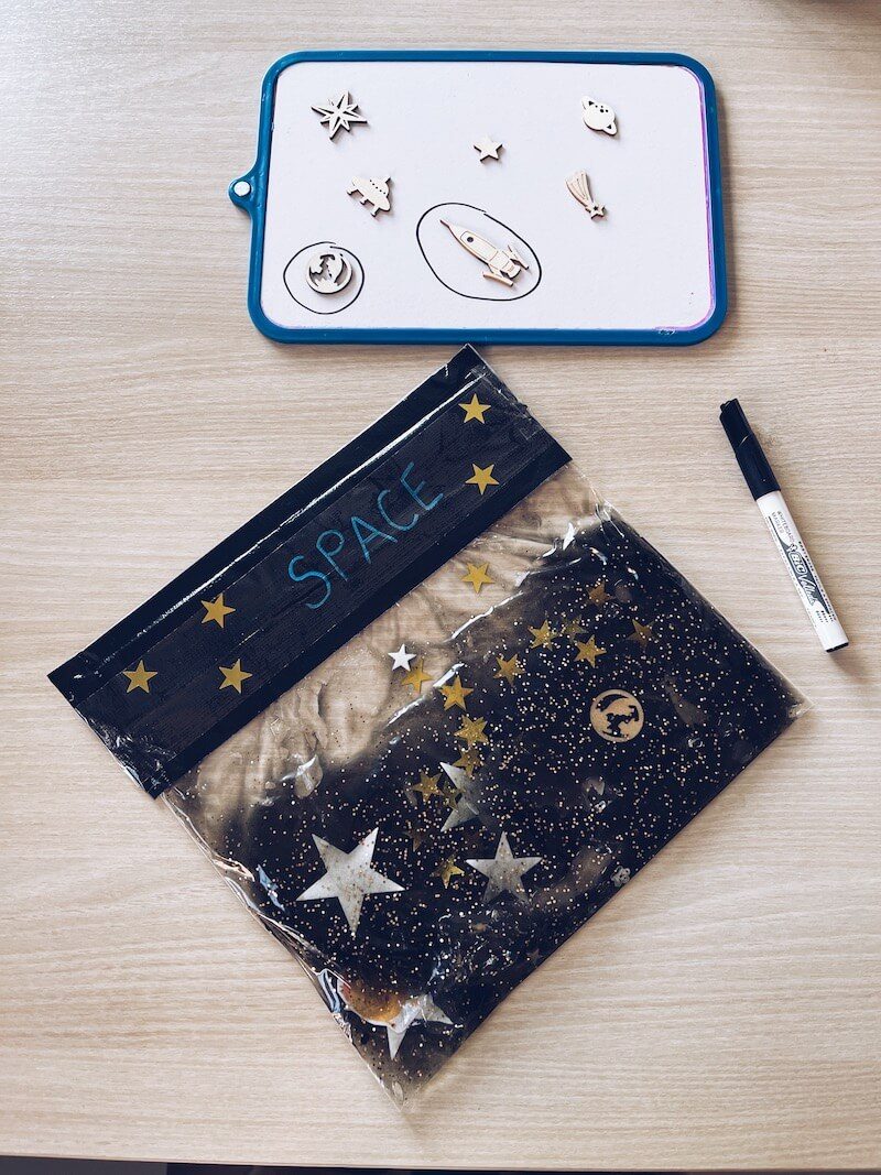 Je kan sensory bottles maken. Vul het flesje met paars, zwart of donkerblauw water waar je glitters en glycerine indoet of vul het met allemaal zwarte bonen en hier en daar sterretjes, kleine accessoires in het thema ruimte.