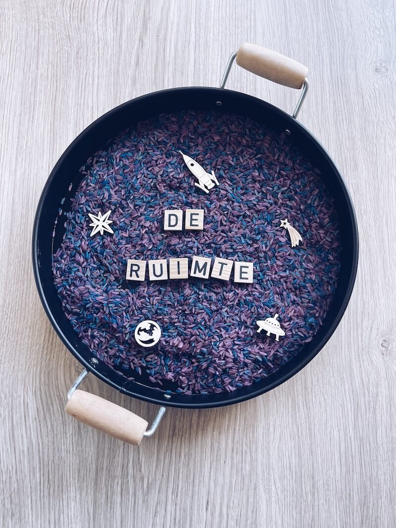 Rijst kleuren is helemaal niet moeilijk. Je leest hier hoe ik mijn rijst kleur. Maak blauw en paars en zwart, leg er wat sterren in, letters, houten figuurtjes en je kan er al heel veel mee doen. Ook leuk om je sensory bin mee te vullen, als basis.
