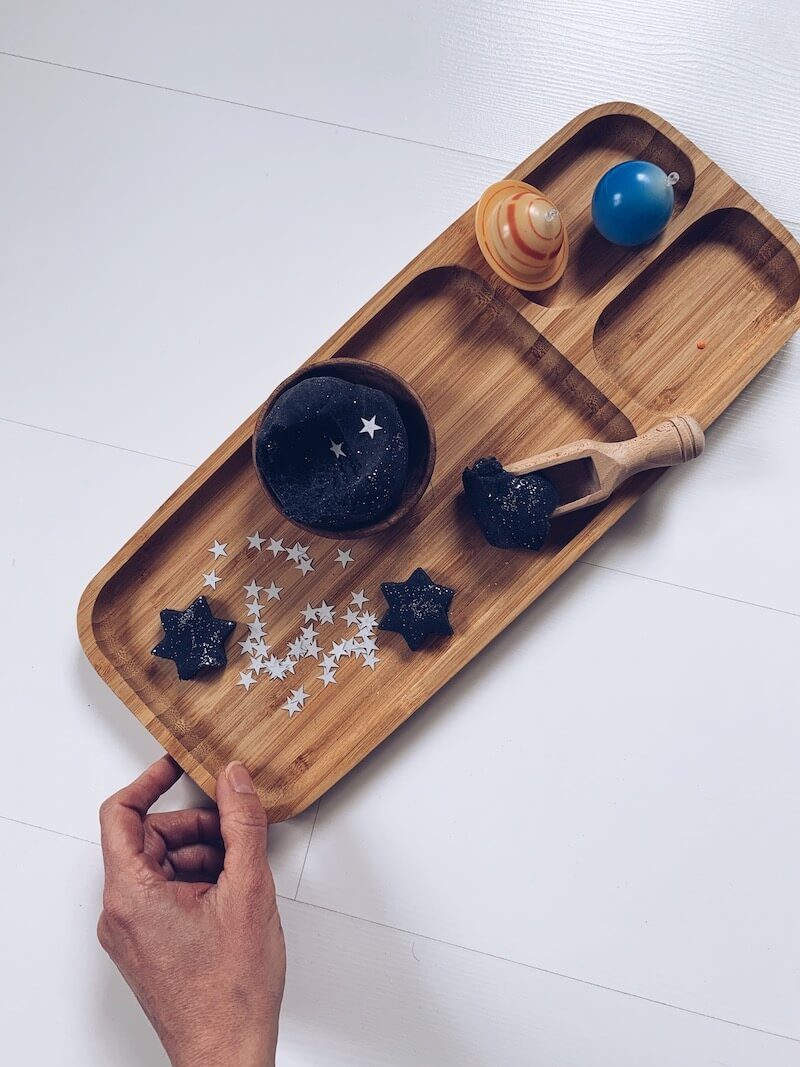 Je kan zelf speeldeeg maken met enkele van mijn eigen recepten. Gebruik dan zwarte, paarse en blauwe voedingskleurstof om ze te keuren. Maak aparte bollen en nadien rol je ze samen op zoals deze swirly speeldeeg. Zo krijg je een galaxy deeg. Natuurlijk kan je ook volledig zwarte speeldeeg maken met bijvoorbeeld zilveren bio glitters in. Leg er wat ruimte uitstekers bij en het hele plaatje is af.