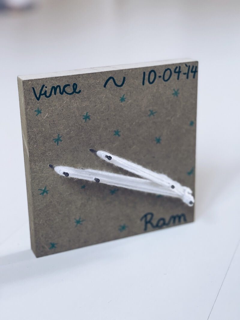 Je kan met spijkers en een stuk hout je sterrenbeeld maken. Vince deed dit toen hij in het eerste leerjaar zat en we hebben dit nu nog steeds op zijn kamer staan. Erg leuk !