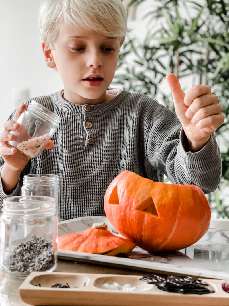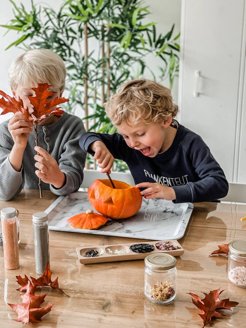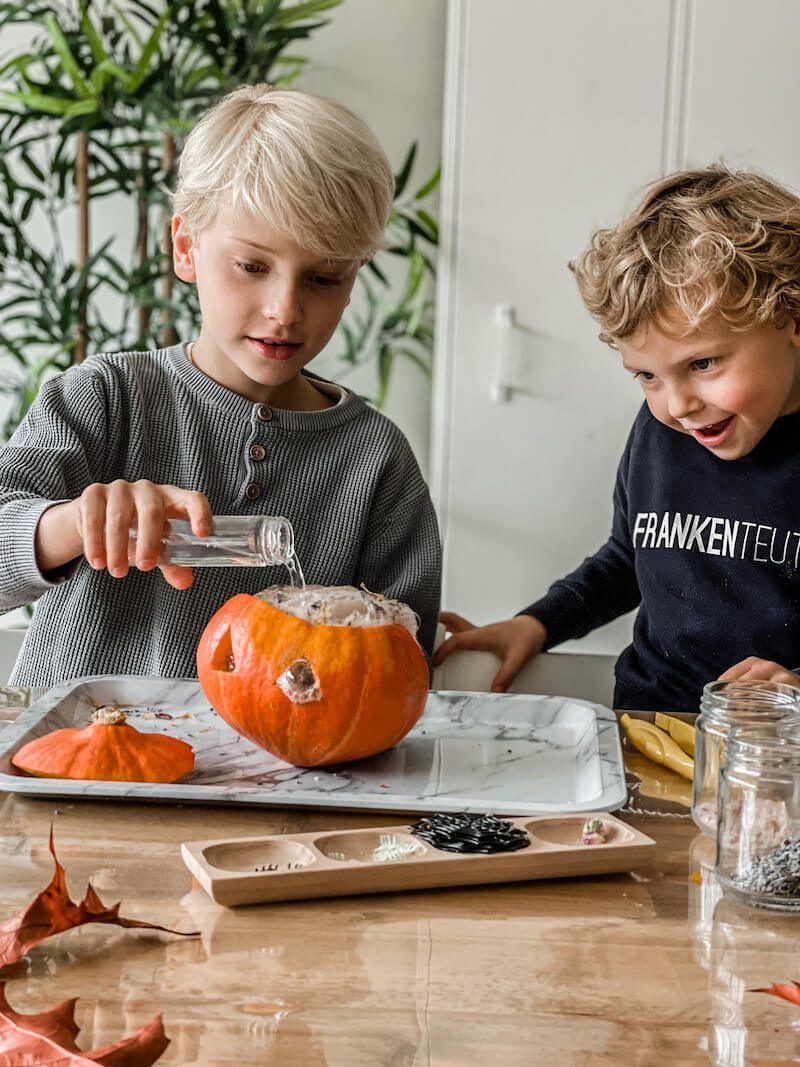 Leg alles leuk klaar zodat de kindjes het gevoel hebben dat ze alles kunnen nemen wat ze willen. Het is hun ‘labo’. Je kan ook een Halloween heksenwinkeltje maken waarbij ze ingrediënten kunnen kopen om in hun heksenbrouwsel te doen.
