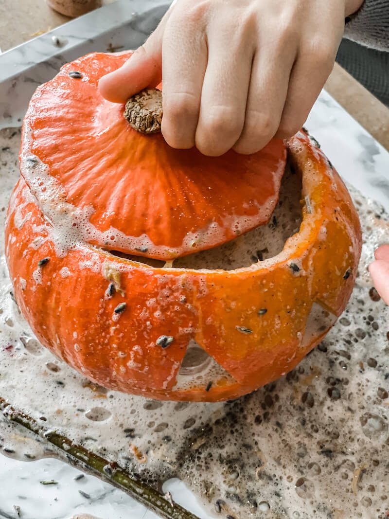 Eerst en vooral hol je de pompoen uit. De pitten kan je gebruiken om te knutselen of opnieuw te zaaien. Gooi ze dus niet weg! Het vruchtvlees kan je pureren en met pompoen puree kan je lekkere muffins, taartjes, soep of pumpkin spice latté’s mee maken. Maak ogen in de pompoen en zorg dat je het hoedje zeker bijhoudt.