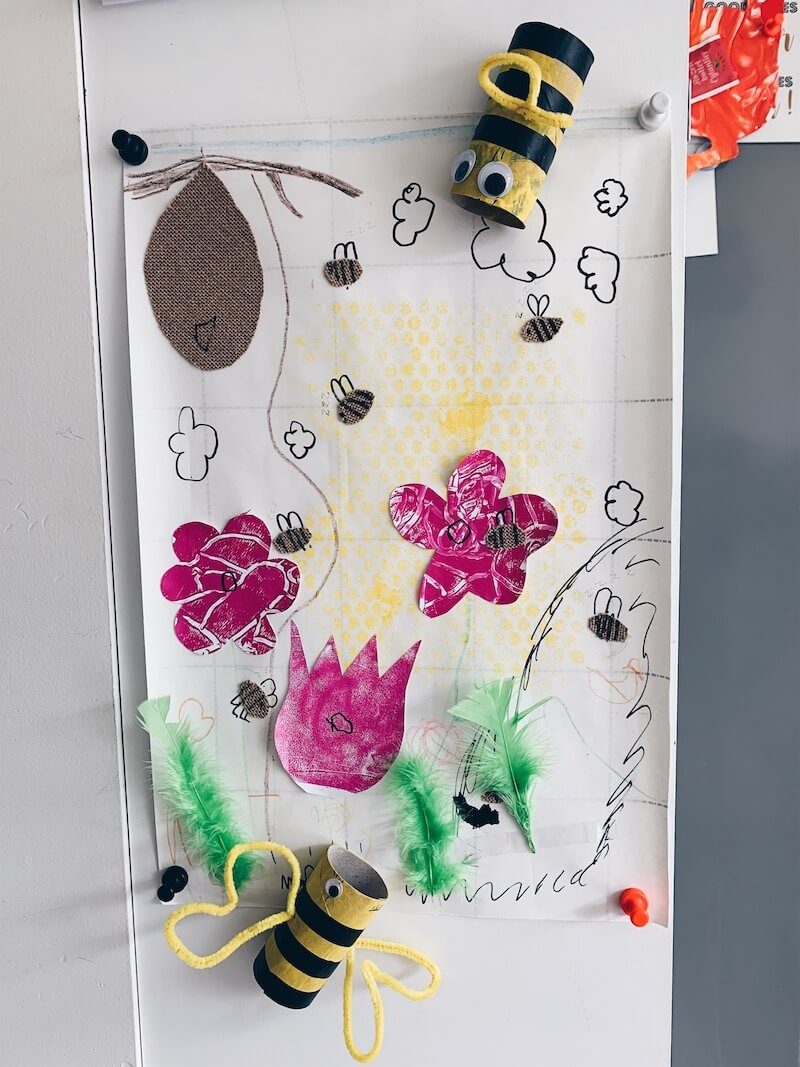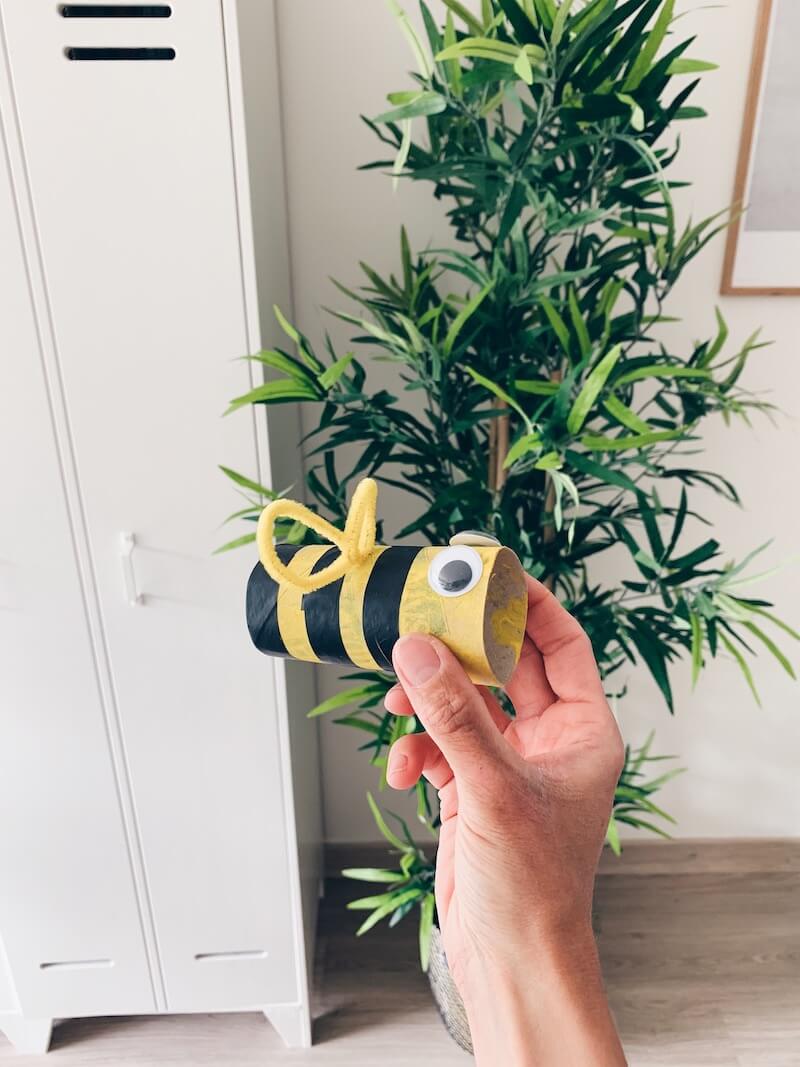 Wij maakten deze bijtjes tijdens de week van de bij door wc-rolletjes geel te schilderen en nadien zwarte tape op te kleven. Dat kan je natuurlijk ook met verf. Met chenilledraad maakten we vleugels en we bevestigden wiebeloogjes. Zo leuk!