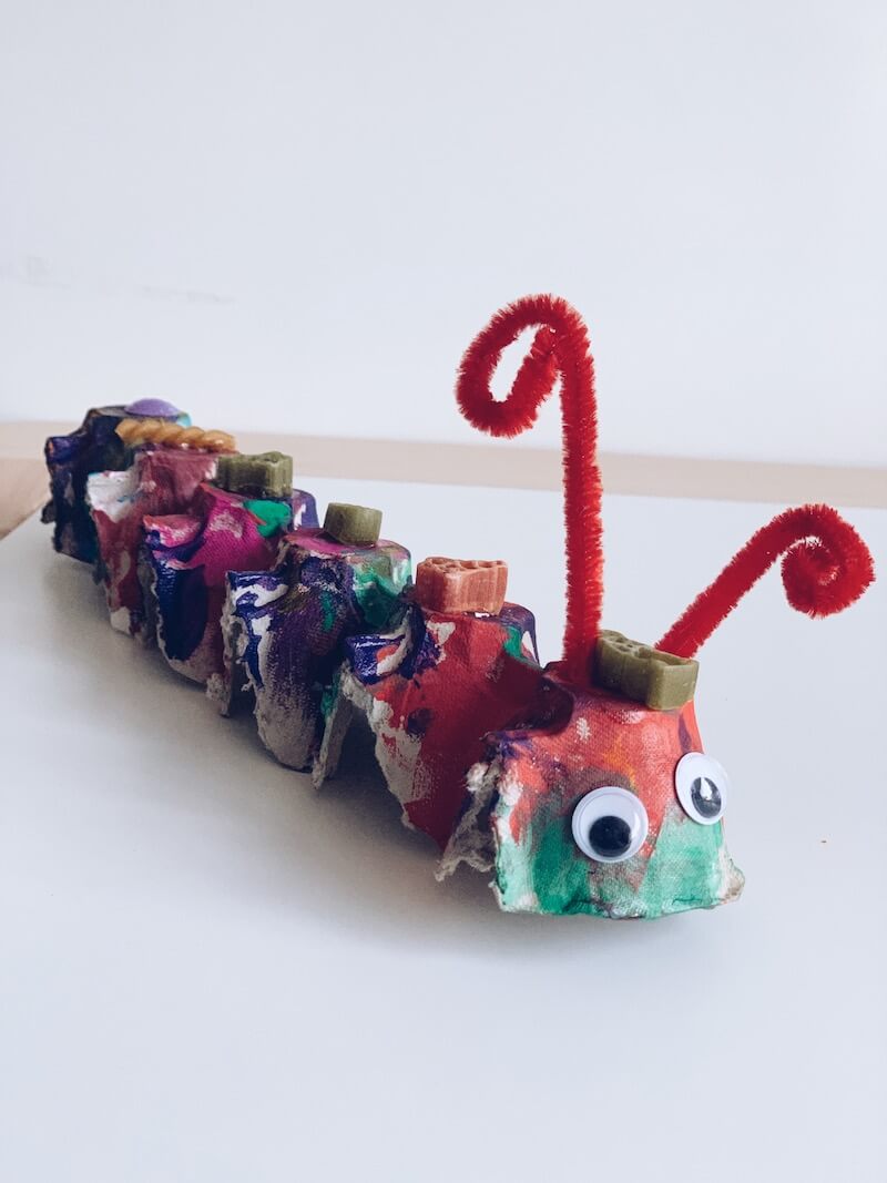 Een rups wordt later een vlinder. Je kan met de kleinsten iets doen rond het bekende Rupsje Nooitgenoeg en je kan ook leuke rupsen maken van klei, karton of zoals op bovenstaande foto: uit eierdozen. Ze vinden dit echt heel leuk!