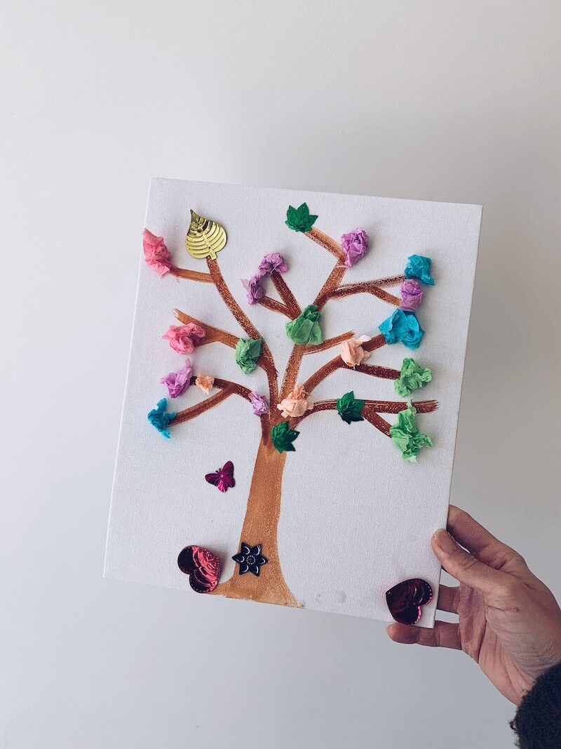 Schilder een boom met takken op een Canvas, stuk karton of stevig wit papier. Geef de boom bloesem door propjes zijdepapier, crêpe-papier of ander materiaal aan de boom te kleven. Pasta is leuk en gedroogde zaden ook! Maar eigenlijk ALLE frutsels die je kunt vinden zijn tof. Laat de kinderen maar beslissen. Je kan ze de blaadjes ook laten stempelen, natuurlijk! En hoe je dat doet? Dat kies je zelf. Gebruik bijvoorbeeld eens aan aardappel als stempel?