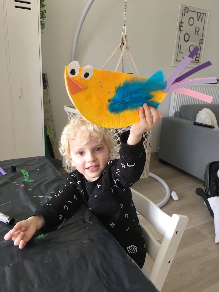 Schilder een bordje geel (of in een andere kleur), vouw een bekje, maag oogjes en gebruik veertjes voor de vleugels. De staart kan je maken door stroken papier of foam papier te knippen.