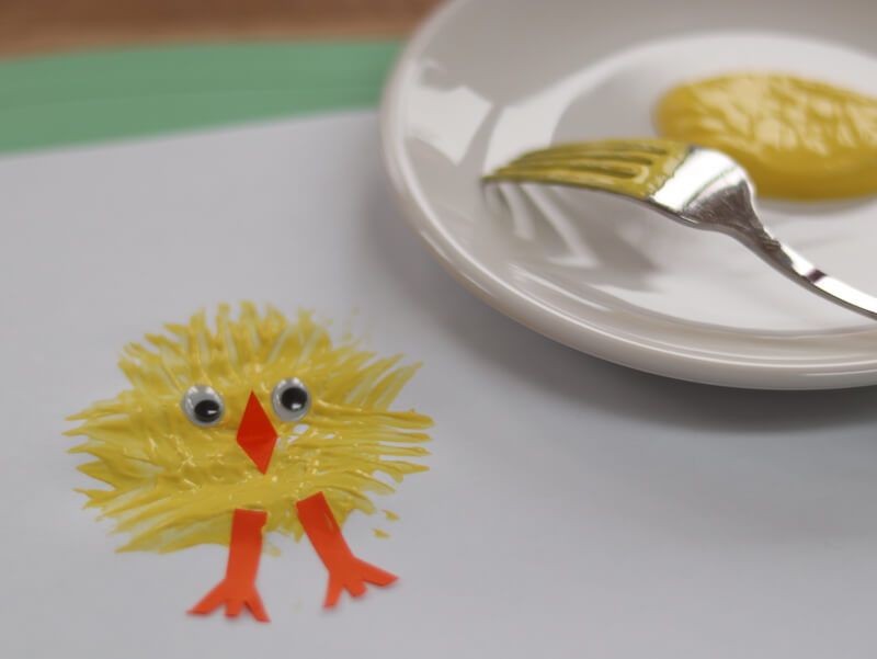 Verven met je vinger of een kwast is leuk. Maar heb je het al eens met een vork geprobeerd? Daar ontstaan hele grappige nieuwe vormen door, zoals dit funky paaskuiken. De snavel, poten en wiebelogen maken hem helemaal af.