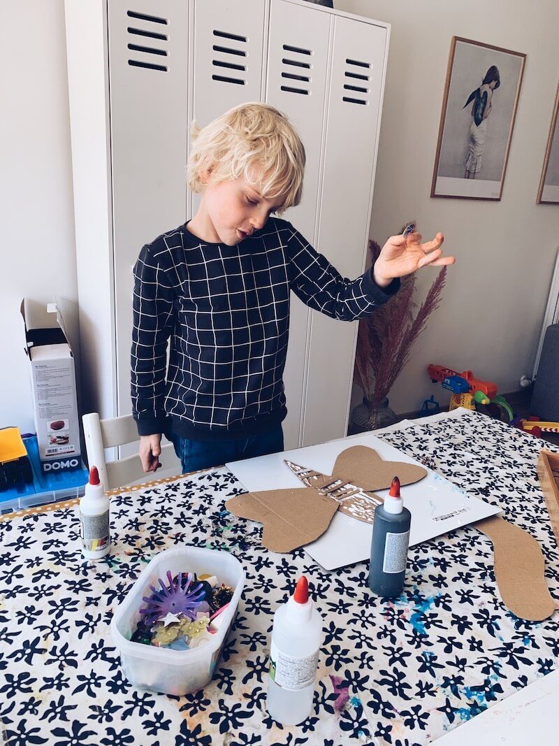 Wie veel karton en lijm in huis heeft, zit met dit knutselwerkje helemaal snor: knutselen met recyclagemateriaal of kosteloos materiaal is kei leuk en wakkert de creativiteit aan. Omdat we bezig waren met het thema insecten thuis, gingen we aan de slag met overschot van karton. We gingen insecten knutselen. Ik sneed delen van insecten uit en knipte uit stukken kartonnen dozen allemaal stroken, stukjes en figuren uit. Dat legde ik klaar samen met lijm, zwarte lijm en nog wat extra knutselspullen. Ik liet Vince doen. Dat was best mooi om te zien.