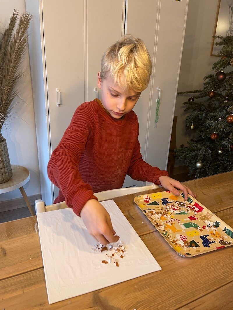 Alles begint dus met die eierschalen. Na het bakken van eitjes gooide ik de schalen niet weg maar ik spoelde ze af en hield ze bij. Na het drogen konden we aan de slag gaan. Ik ga mijn zonen een hamertje en wat halve eierschalen en liet ze volledig losgaan. Dat vonden ze natuurlijk geweldig. Ze kregen een canvas van mij en dat mochten ze vol kliederen met witte hobbylijm. Ik gaf ze een penseel, spoot hobbylijm op het canvas en vertelde hen dat ze hun eierschaaltjes op het canvas mochten strooien en vastkleven. Hoe dat ze dit wilden doen maakte mij niet uit. Beiden hadden wel meteen de neiging om de schaaltjes mooi te verspreiden. Het leek wel een mooie mozaïek. We lieten ze een dagje drogen op de verwarming.