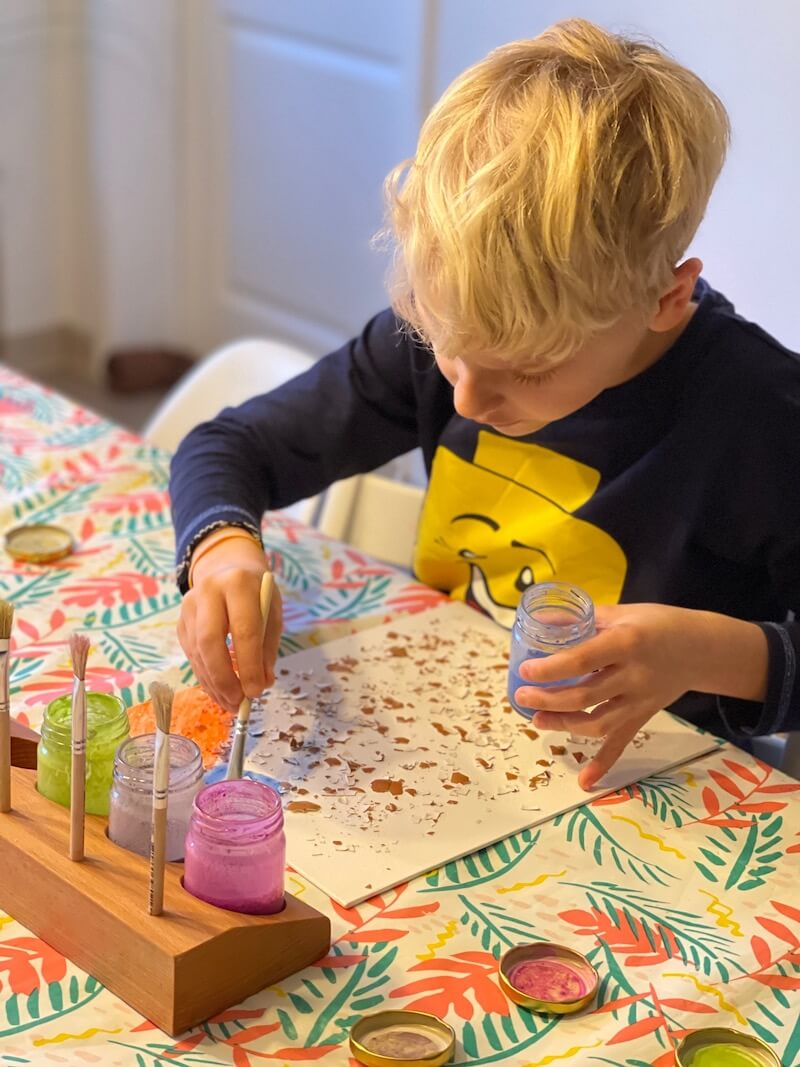 Zoals je al eerder kon lezen, maakten we zelfgemaakte waterverf. Dat deden we trouwens de dag ervoor in de vakantie. Ideaal om de twee te combineren. Er waren geen regels… gewoon doen. Ik zette nog wat glitters klaar. En kijk… wat voor mooie kunstwerken hier uitgekomen zijn. Vooral mijn oudste zoon, die heel graag knutselt, genoot hiervan. Want hij en enkel hij had heel dat proces mogen kiezen. Er was geen goed of fout, enkel zijn creatie! En het was prachtig!