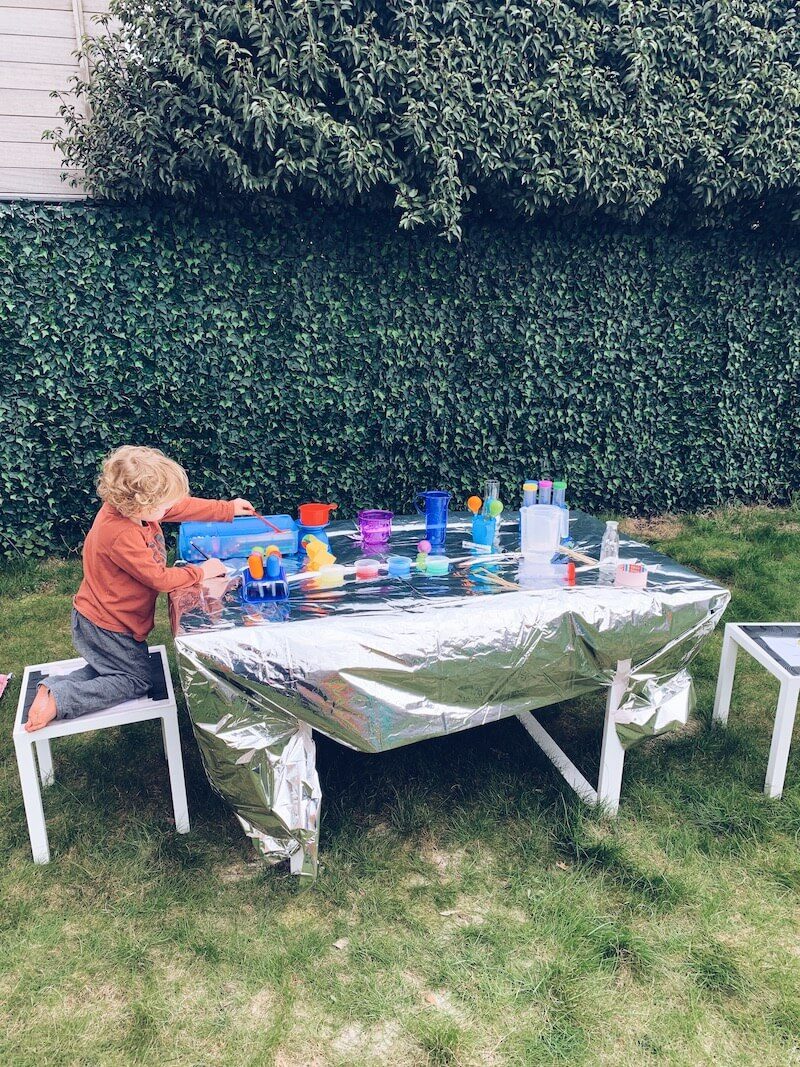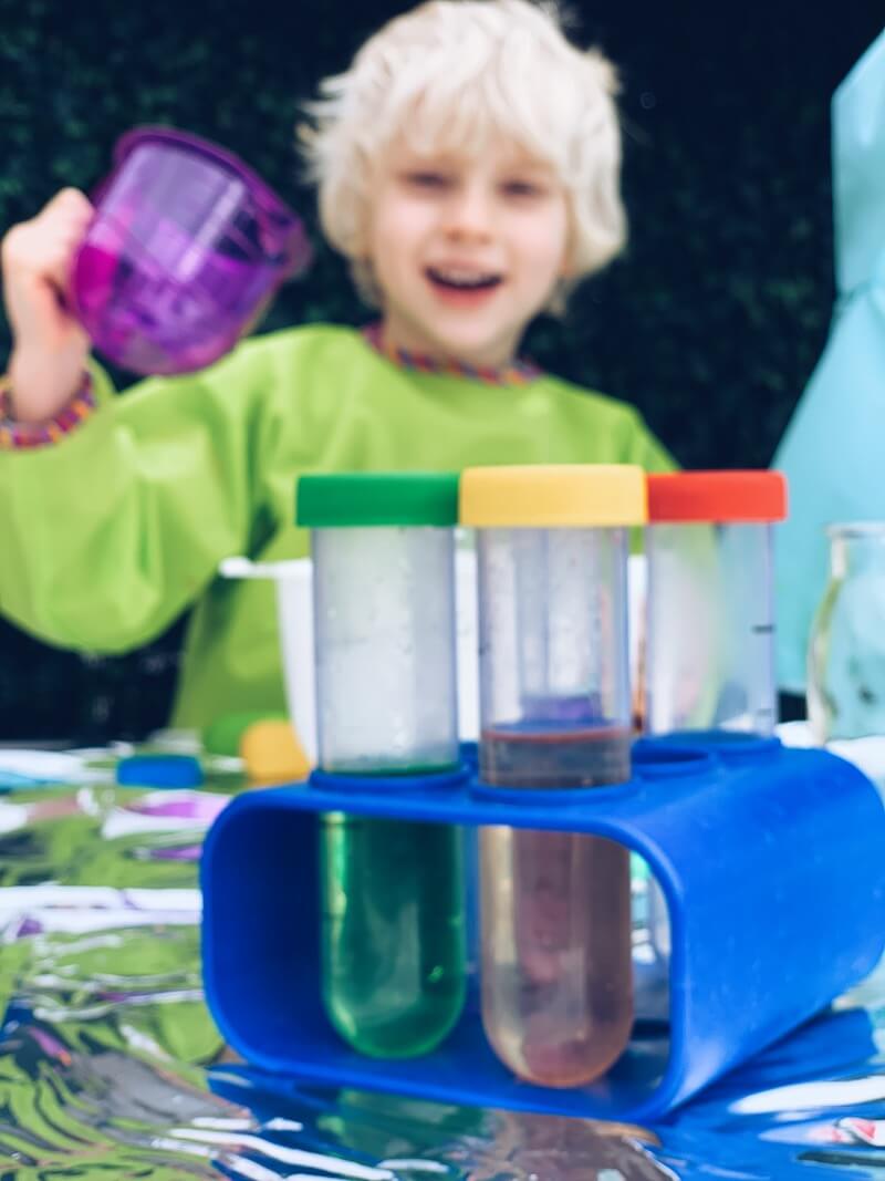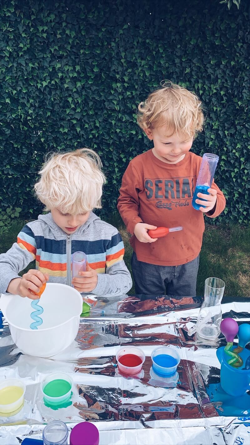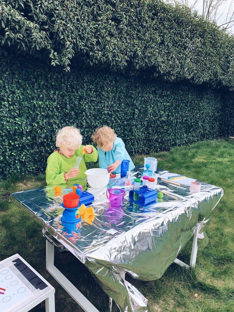 Om je kinderen te laten ontdekken (in bijvoorbeeld een wetenschapslab voor kinderen) is het eigenlijk belangrijk dat je verschillende materialen hebt: bekertjes, kommetjes, reageerbuisjes, schepjes enz… Open ended play noemen ze dat. Speelgoed waar ze eindeloos mee kunnen blijven spelen. Je kan er uiteraard educatieve spelvormen van maken. Voorbeelden kan je onder andere op mijn Instagram account OUT OF THE BOX PLAY vinden. Kinderen leren zo verschillende materialen, texturen, gewichten kennen. Je zal zien hoe lang ze zich ermee bezig kunnen houden. Dit kan gewoon, zomaar , of in een bepaald thema.