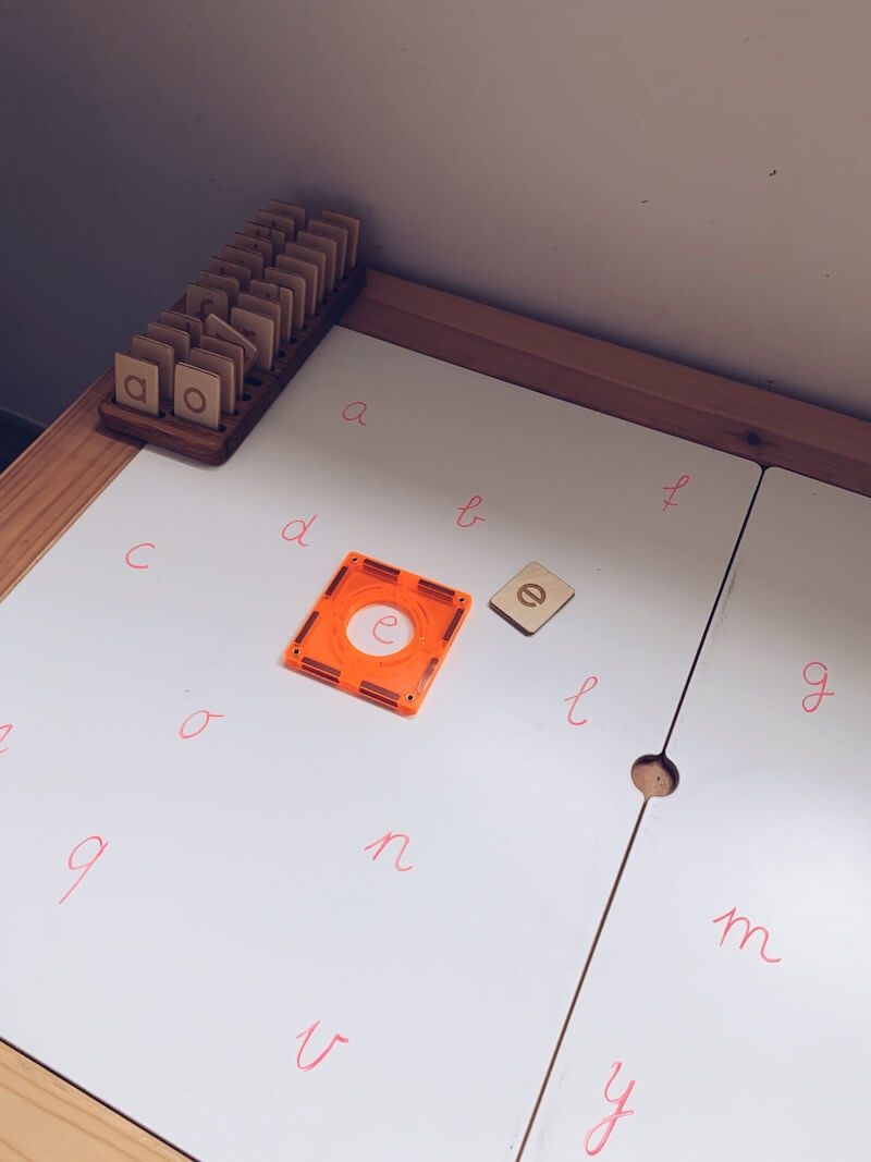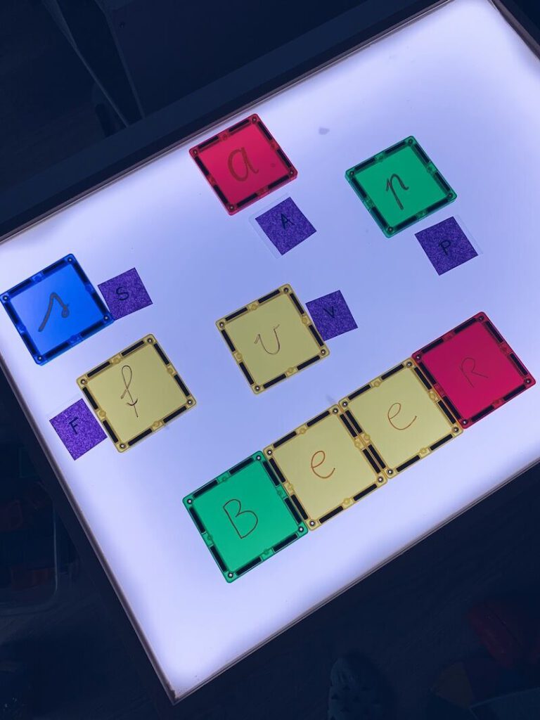 Je kan met window markers op de magnetische tegels schijven. Zo kan je op een groot blad hoeveelheden leggen of letters schrijven en op de magnetische blokken kan je dan de schrijfletter of het cijfer zetten (ik gebruik wel eens oud behangpapier). Je kan het ook gewoon matchen met elkaar: cijfers leggen en de hoeveelheid aan blokken erbij leggen. Je kan er heel veel mee doen. Think outside the box. Ik gebruikte de Matoyli tegels op een lichttafel. Dubbel zoveel plezier.