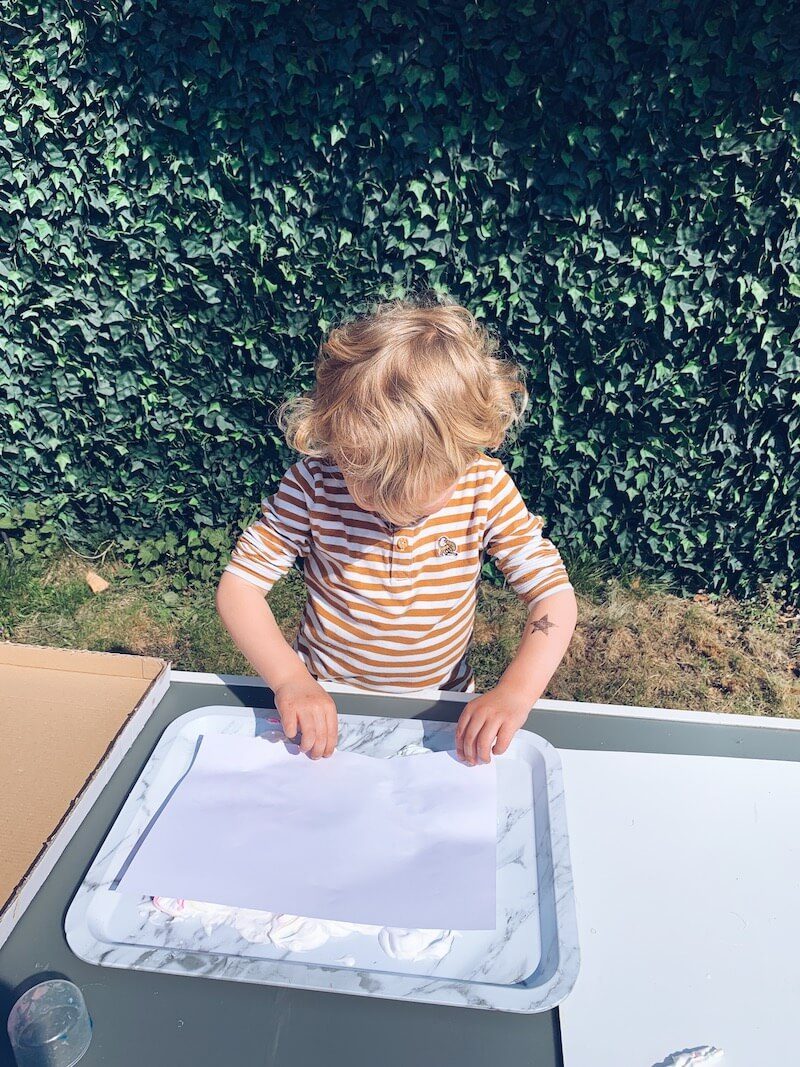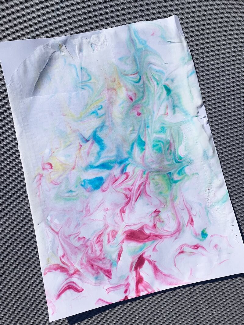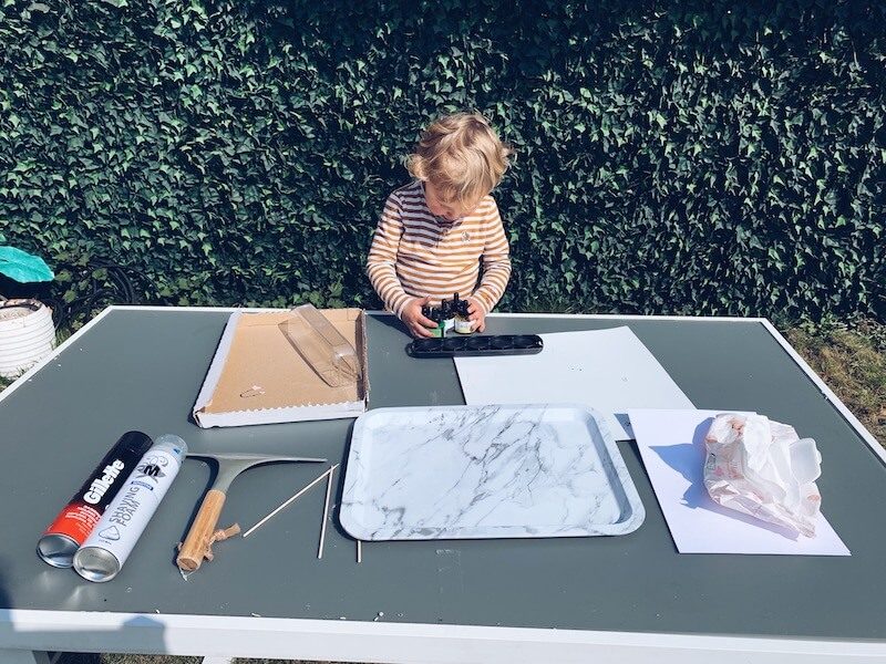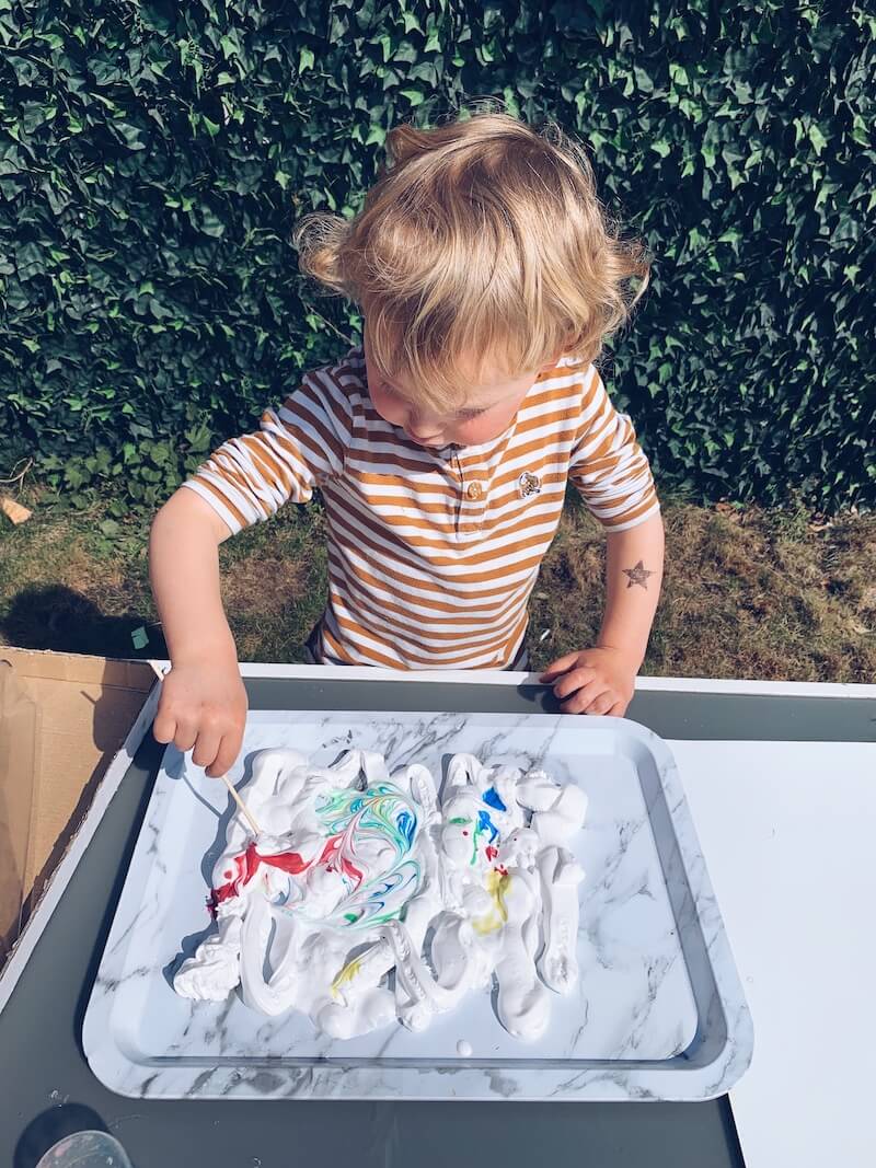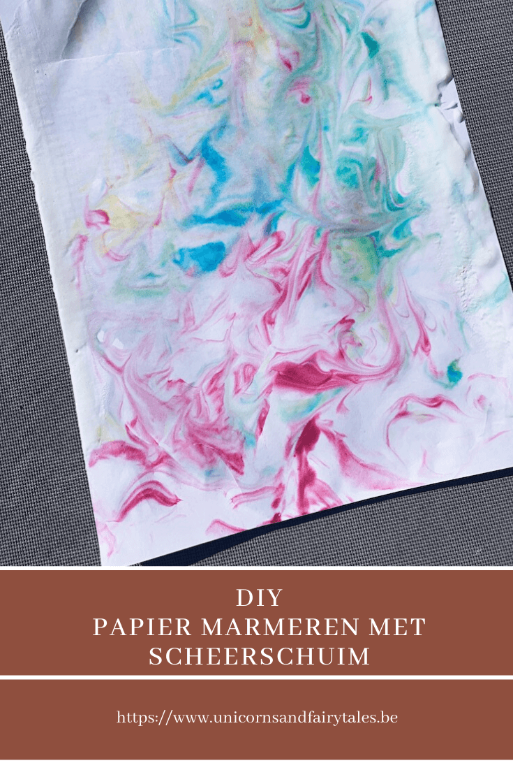 Wij gingen papier marmeren met scheerschuim en ecoline en deden dit buiten in het zonnetje. Het was zalig weer en we zaten in lockdown tijdens de corona crisis dus we hadden tijd zat om te experimenteren met deze leuke verftechniek. De kinderen vonden dit trouwens heerlijk en mochten van mij na het marmeren nog met het scheerschuim spelen. Heerlijk sensopatisch spel. Ik zette een teiltje met water klaar voor hun handjes en voilà , dat messy play gedoe viel best nog mee. Ik kan daar allemaal wel tegen.