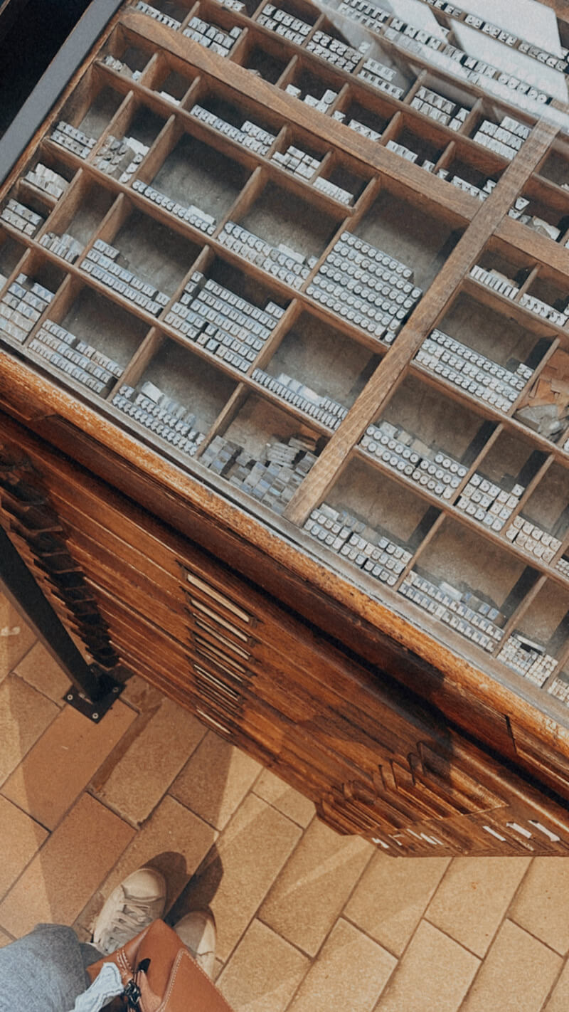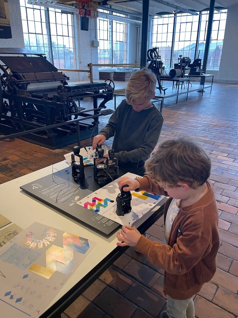 Wij begonnen op de bovenste verdieping. Daar gingen we Tinkeren. Ze hebben hun eigen Tinkerstudio waar kinderen met kosteloos materiaal aan de slag mogen gaan. Natuurlijk verbleven onze twee creatievelingen daar zeker een dik uurtje. Nadien begonnen we aan onze tour. Je kan ook inplannen dat je eerst een rondgang doet en nadien gaat knutselen. Je komt meer te weten over de textielindustrie. Hoe het begon met spinnenwielen en verder vorderde…Hoe katoen en wol en andere grondstoffen verwerkt worden tot draden, hoe matten geweven worden enz… Ook de drukkunst staat in het industriemuseum hoog op de kaart. Je reist doorheen de geschiedenis van het drukken. Ook daar kan je een workshop van volgen! Onze kinderen mochten een mini magazine afdrukken en konden zo doorheen de verdieping van het drukken stempelen en opdrachten vervullen.