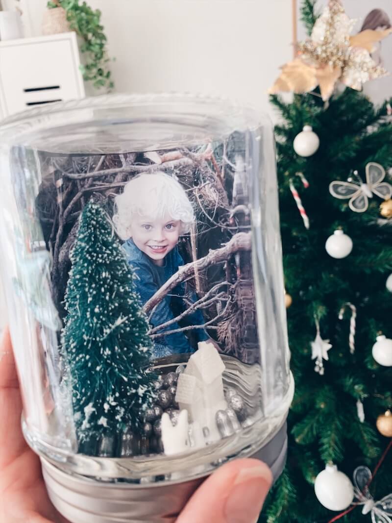 Per toeval had ik een foto van Vince in het bos, maar eigenlijk is het echt leuk als je een foto hebt van je kind dat bij de boompjes en decoratie past. Zo niet is dat natuurlijk ook niet zo erg. We kleefden met het lijmpistool alles aan de binnenkant van het deksel, staken de foto met de nieuwjaarswensen erin en nog wat glitterbolletjes, schroefden het deksel op de bokaal en voila, een mooi resultaat (vind ik toch…) Het is toch weer eens wat anders dan een brief en dit zetten de mensen makkelijker weg.