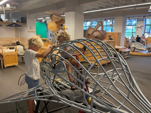 Er was bijvoorbeeld een hoek waar je muziekboxen en dvd-spelers uit elkaar kon halen, om dan zelf met die electronica iets te bouwen. Manlief begon daar al snel aan een muziekbox te prutsen. Met de magneten die we daarin vonden, deed ik een klein experiment met de auto die Lex en ik bouwden. Vince bouwde dan weer aan zijn eigen ruimtestation… Trouwens, dat experiment met de magneten kan je ook vinden in mijn boek SPEEL!