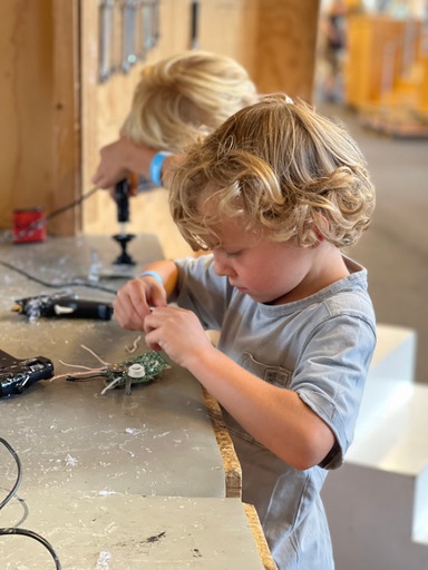 Je hoeft in de Ontdekfabriek geen stappenplannen te volgen om allemaal hetzelfde resultaat neer te zetten. Ze zijn zo gemaakt dat je zelf aan de slag kunt, mits wat uitleg en daar je eigen ding mee kunt doen. Alle opdrachten zijn heel STEM-gericht. Techniek, electronica, hamers, schroevendraaiers… Je kan met van alles aan de slag gaan. Onze eerste hoek waren de racewagens bouwen. Hoe je dat deed, was volledig up to you. Onze jongens konden dus écht hun fantasie de vrije loop laten. Vince begon bijvoorbeeld te bouwen, en zei toen dat hij niet wist waar hij net aan begonnen was. Dat is toch geweldig?