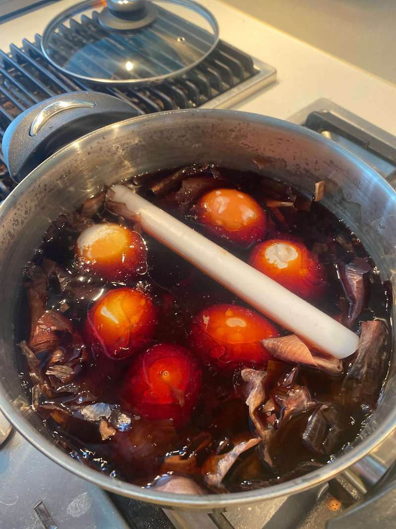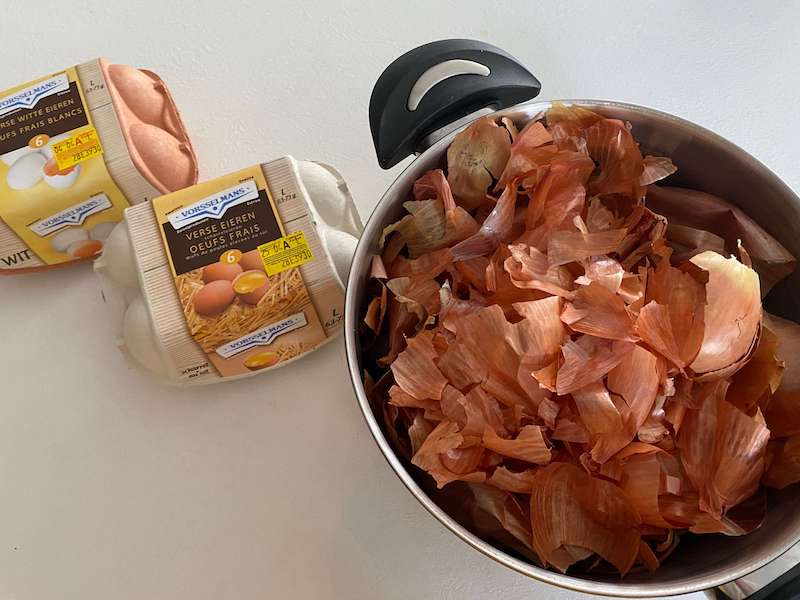 Vul je kookpot tot bijna aan de rand met uienschillen en voeg voldoende water toe zodat straks de eieren volledig onder water kunnen. Zet het water al op en laat de schillen al een keer goed opkoken. Zo geven ze al een mooie bruine kleur aan het water en terwijl kan je beginnen aan het versieren van de eieren. Eens het water gekookt heeft, zet je het vuur maar even uit en laat je de uienschillen goed trekken. Hoe meer kleur ze afgeven hoe mooier de eitjes kleuren. Als je meer tijd hebt kan je eventueel ook de dag op voorhand de schillen al eens koken en ze dus een volledige nacht laten trekken.
