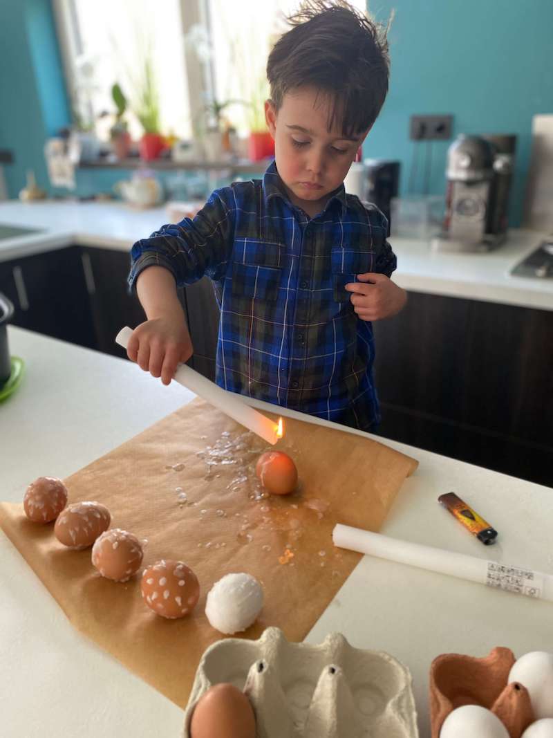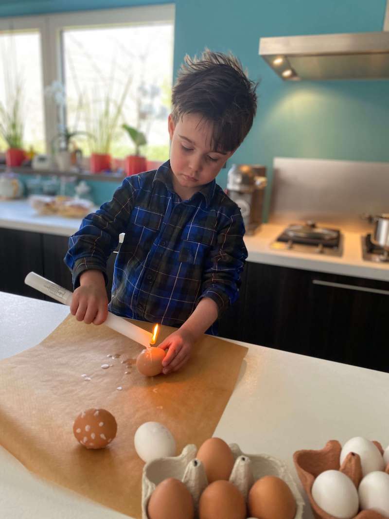 Om de eitjes te versieren, laat je gewoon gesmolten kaarsvet op de eitjes druppelen en maak je zo een tekening. Mijn oma en mama maakte altijd hele mooie tekeningen in de eitjes, zoals bloempjes, gezichtjes, … Mijn 4 jarige maakte een eigen interpretatie. Hij maakte vooral stipjes, streepjes en vlekken op zijn eitjes, maar hij deed het wel vol overgave.