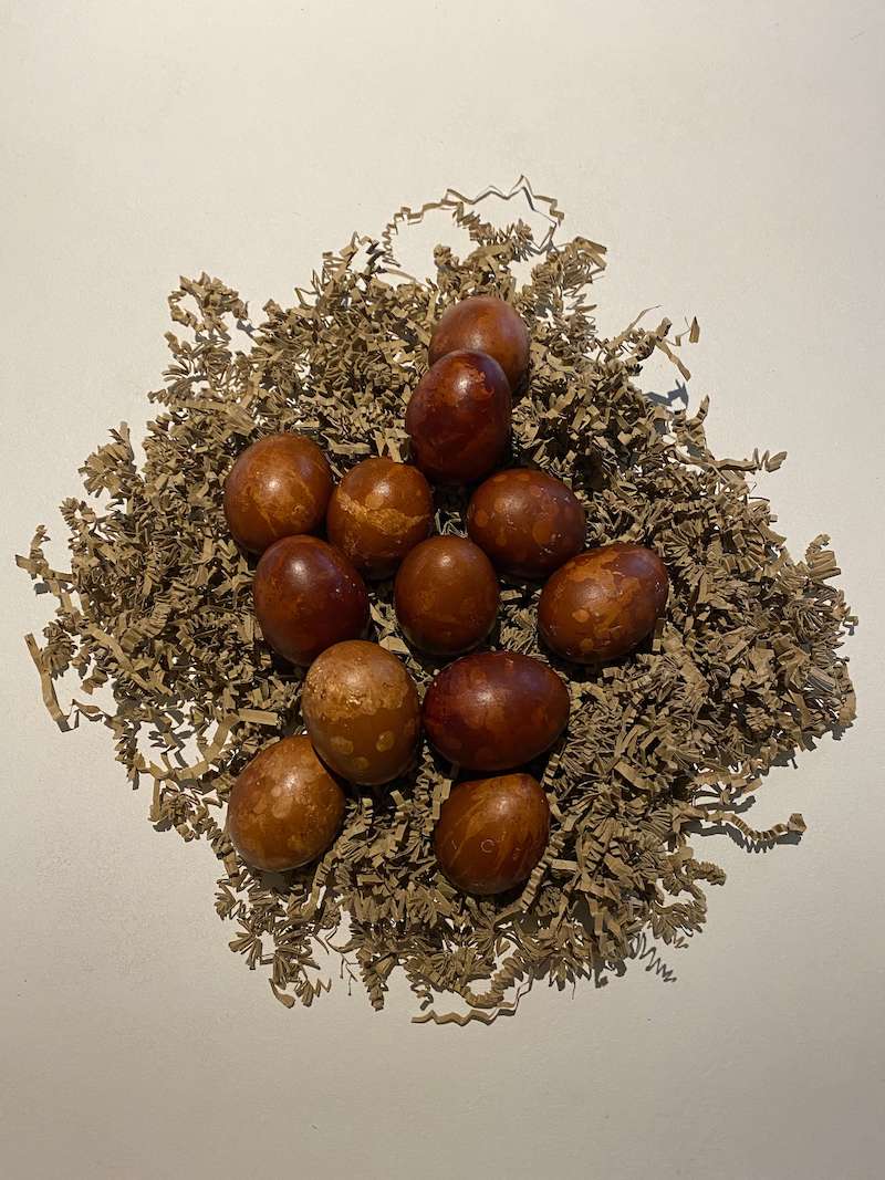 Eens je eitjes mooi versierd zijn, zet je het water met de uienschillen, terug op. Wanneer het water opnieuw kookt leg je de eieren voorzichtig tussen de uienschillen. Duw ze eventueel voorzichtig onder water, maar zorg dat ze elkaar niet aanraken. Leg er ook de overschot van je kaars bij in, zodat deze mee kookt en smelt. Door dit extra kaarsvet toe te voegen komt de tekening nog mooier op de eitjes. Laat ze nu 10 à 12 minuten koken. Vis de eitjes uit de pot en laat ze afkoelen op een bakpapier of in een bord (let wel dat er nog kaarsvet in je bord zal druppen). Ze niet laten schrikken onder koud water. Wanneer ze koud genoeg zijn om vast te houden, gewoon wat afkuisen met een stukje keukenrol en je hebt prachtige zelf gekleurde paaseieren!