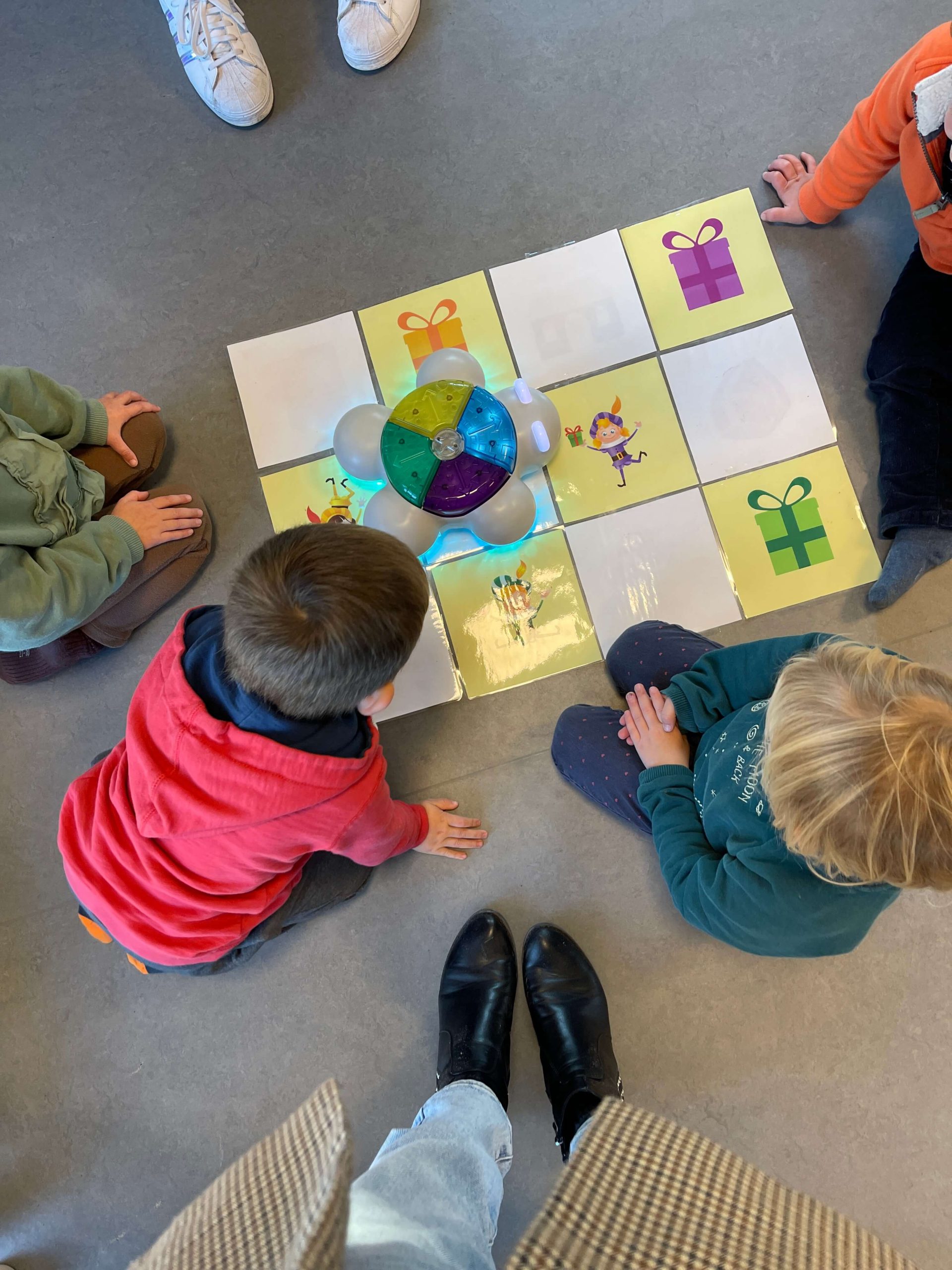 Eerst maakten de kinderen kennis met de Glow&Go bot. Ze mochten ontdekken wat hij kon en we gingen alvast eens aan de slag met enkele stapjes. Hoe laten we hem vooruit gaan? Hoe gaat hij naar links, rechts en achteruit? Kan hij meerdere stapjes na elkaar doen enzovoort…We stimuleerden het taalgebruik. Daarna introduceerden we de Sinterklaas Glow & Go bot mat die ik zelf maakte.
