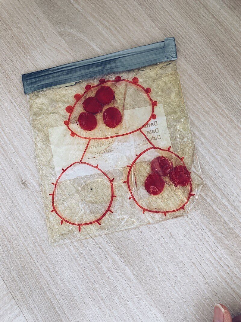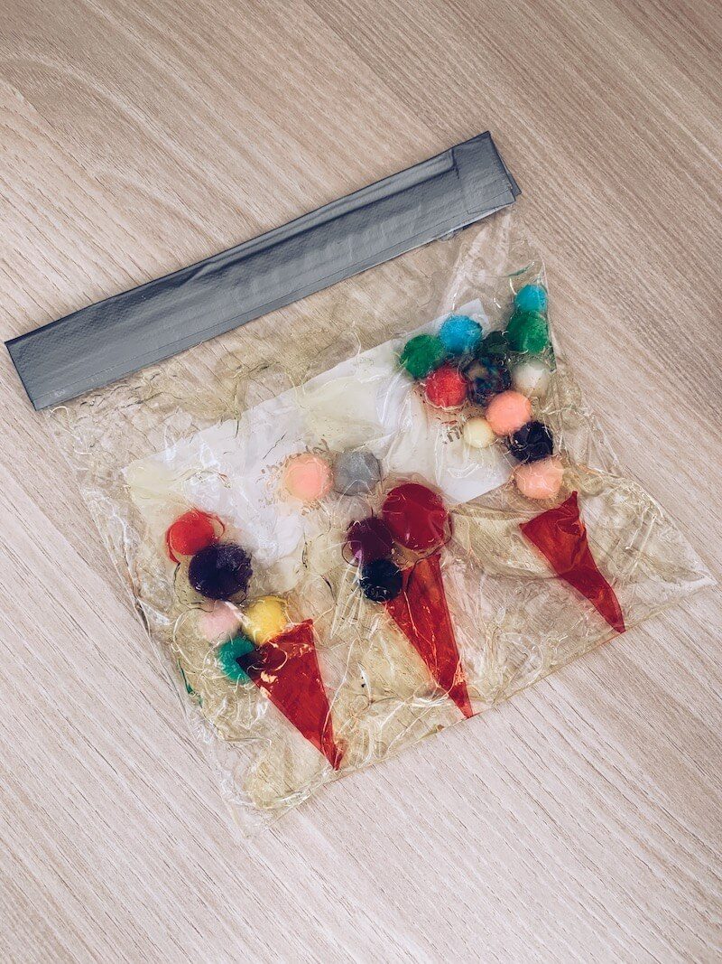Je kan voor je klas of kinderen thuis sensory bags maken om splitsingen te oefenen. In het beste geval heb je er voor elk getal eentje nodig. Op voorhand kan je er met alcoholstift iets op tekenen zodat ze weten waar ze moeten splitsen. Ik vulde het zakje met pompoms maar je kan evengoed andere kleine dingen in de sensory bag steken. Ik gebruikte haargel en kleefde de zak toe met ducktape.