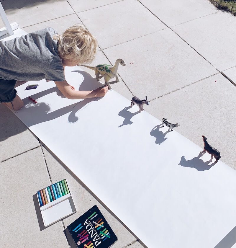 Op een zonnige dag kan je met een grote behangrol en speelgoed aan de slag gaan. Zet een hele constructie klaar en teken de schaduwen over. Kleur ze in! Een toffe bezigheid als je wat tijd hebt. Je kan dit ook met meerdere kinderen tegelijk doen! Zorg dan voor een heel lang blad.