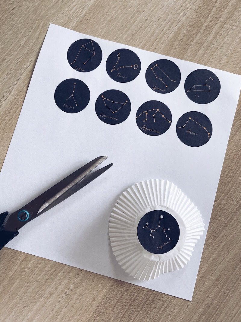 Print de sterrenbeelden uit en knip ze uit. Kleef de rondjes onderaan op de cupcake wikkel. Prik dan de gaatjes open door te werken met een matje en een priknaald. Ook dit kunnen kinderen zelf! Versier dan je wc-rol zodat het binnen het thema van de ruimte past. Misschien willen ze hun koker verven of bekleven? Of willen ze er een raket van maken? Wij wikkelden er aluminiumfolie rond. Laat vooral de kinderen zelf beslissen. Plaats de cupcake wikkel op het kokertje en zet vast met een elastiek. Schijn nu met een lichtbron in de koker in een donkere kamer.