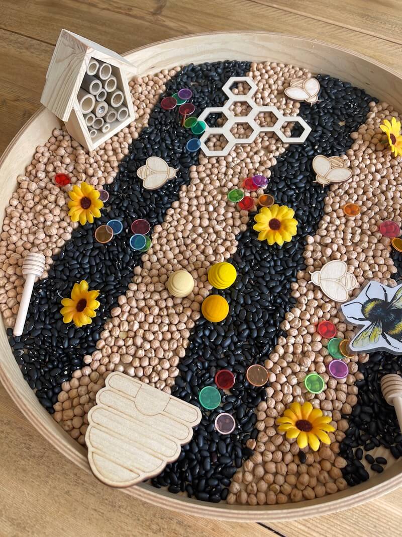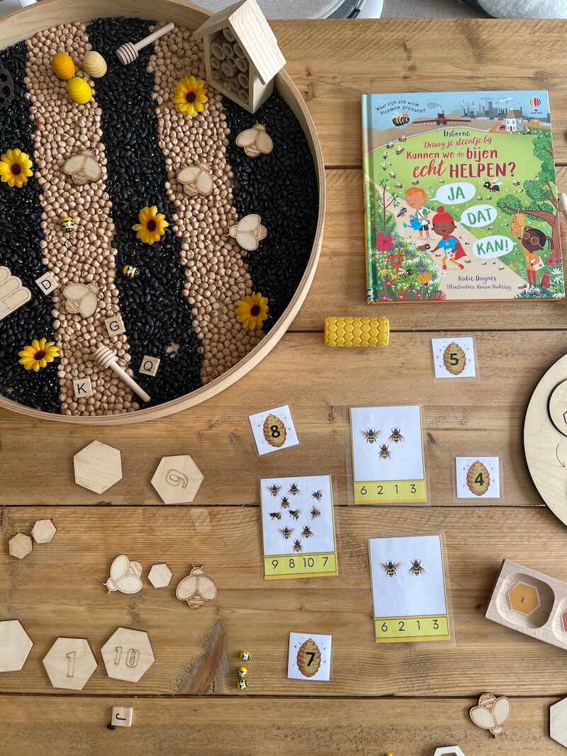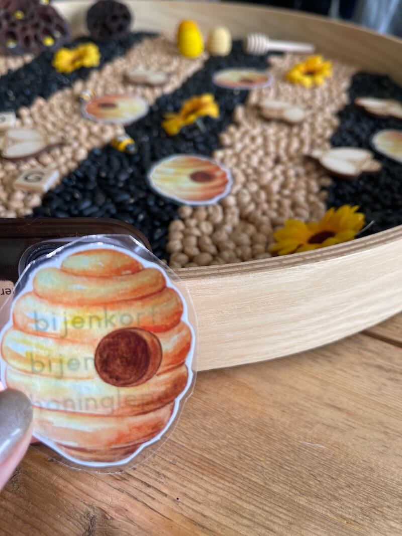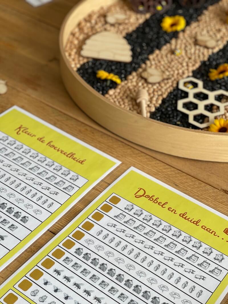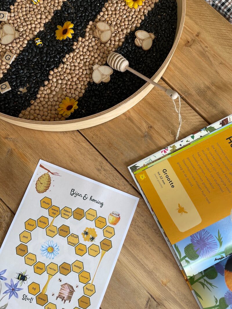 Het is superleuk om een sensory tray te maken rond het thema ‘de bij’. Zeker bij de jongere kinderen. Combineer de printables en materialen met een sensory tray. Het stimuleert de zintuigen en is goed voor de vele verbindingen die in de hersenen worden gemaakt. Bovendien werk je hier ook aan de motoriek van de kinderen.
