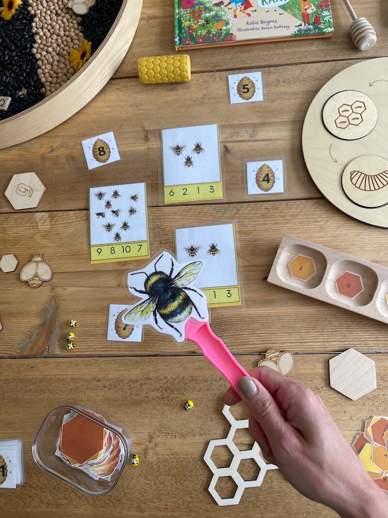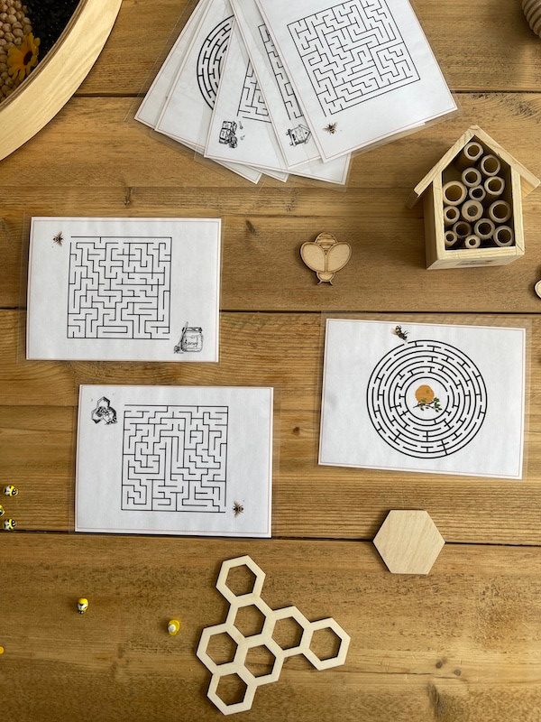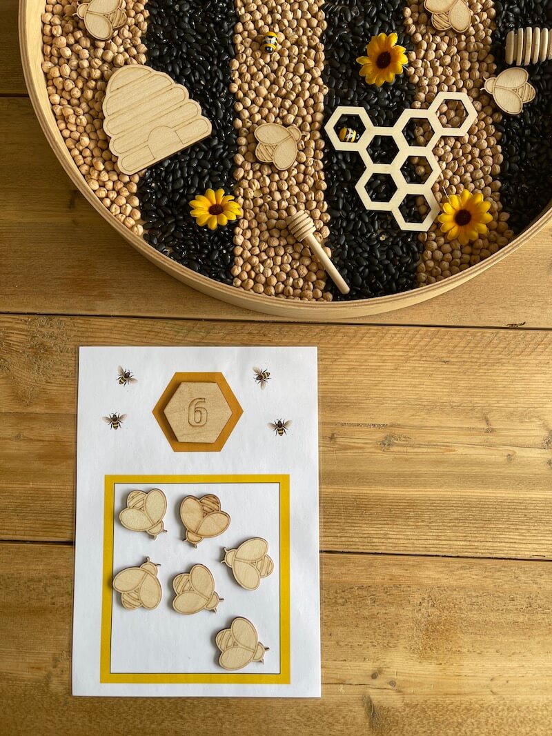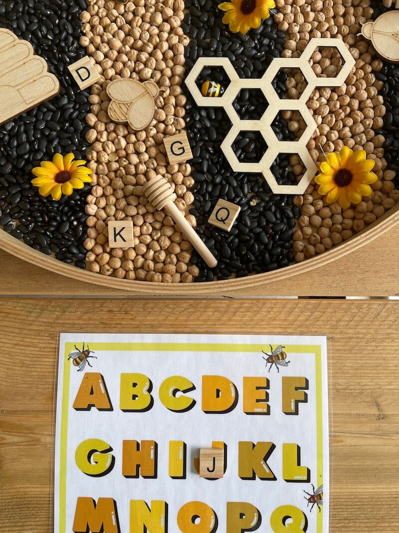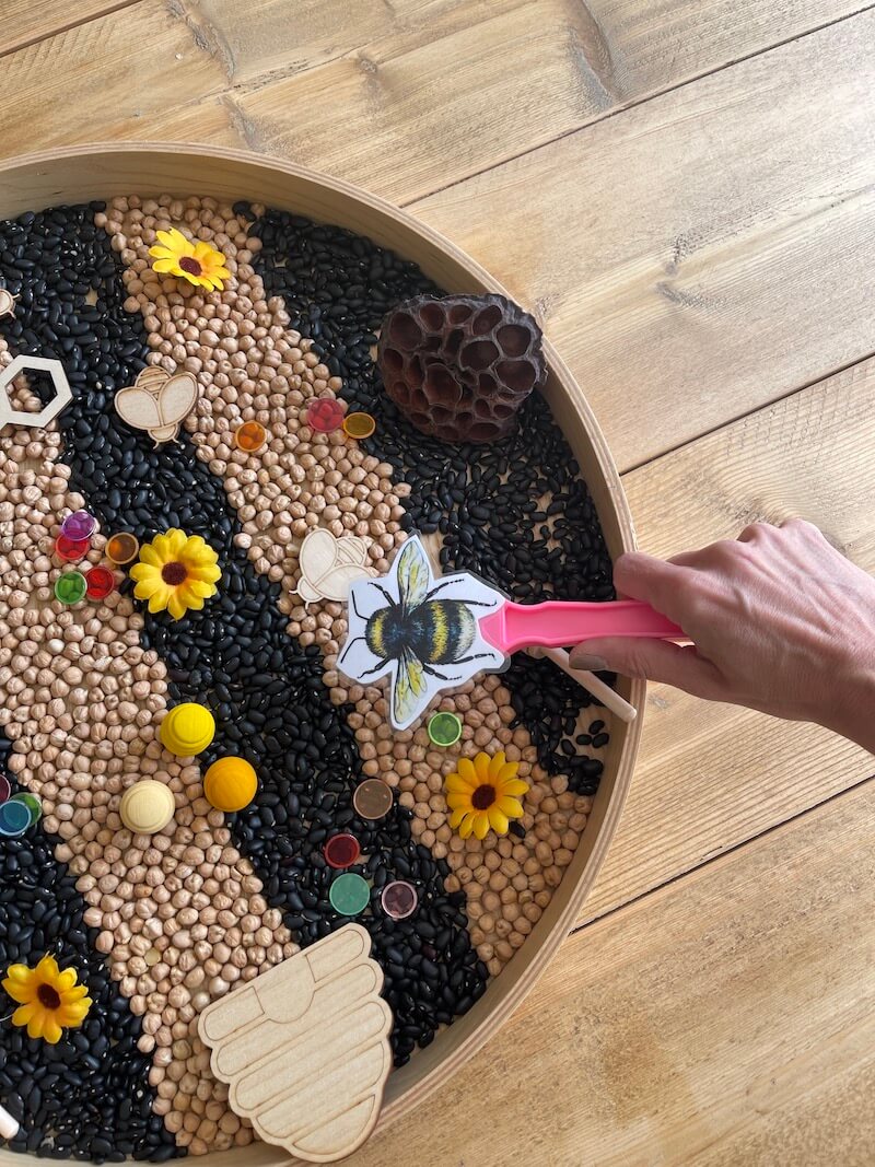 Het is superleuk om een sensory tray te maken rond het thema ‘de bij’. Zeker bij de jongere kinderen. Combineer de printables en materialen met een sensory tray. Het stimuleert de zintuigen en is goed voor de vele verbindingen die in de hersenen worden gemaakt. Bovendien werk je hier ook aan de motoriek van de kinderen.