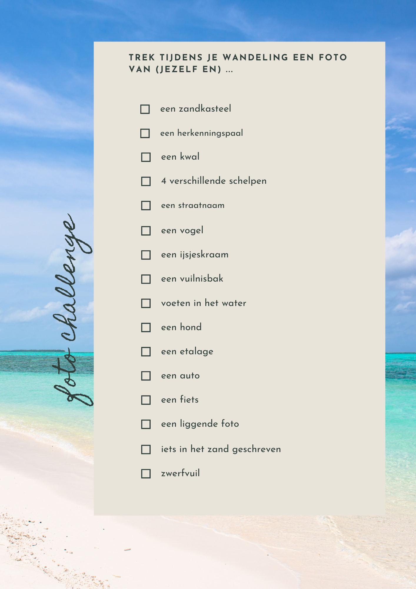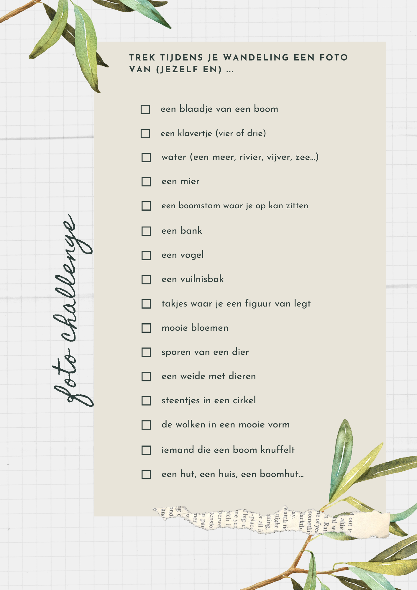 Geef je kinderen een camera (wij hebben een Vtech Kidizoom fotocamera) en laat ze onderweg een foto challenge doen. Dit deed ik met mijn klasgroep op zeeklassen en het was mega leuk! Ideaal dus om de challenge ook aan zeurende tieners of kinderen te geven. Wedden dat het wandelen met kinderen veel leuker en interessanter gaat maken? Ik heb er eentje gemaakt voor in een bosrijke omgeving en eentje als je aan zee bent. Je kan ze beiden gratis downloaden…