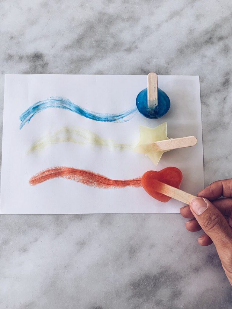 Vul ijsblokvormpjes met verf en steek er een houten stokje in. Na enkele uren in de vriezer zijn ze klaar en kan je ijsverven! Niet eetbaar natuurlijk… hahaha.