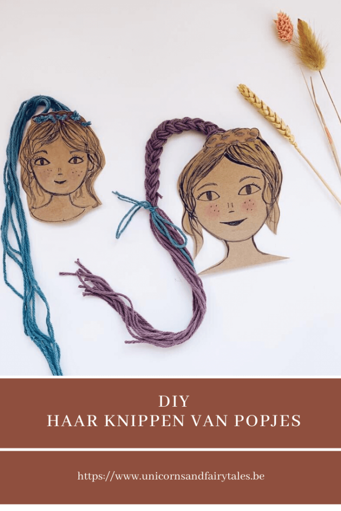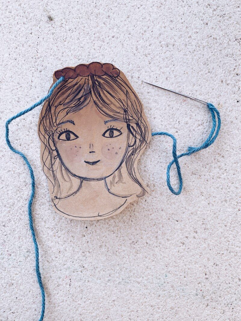 Ik tekende twee popjes en naaide er met wol zogezegd haar aan. Je kan dat op twee manieren doen: haartje per haartje en toeknopen of in een keer, maar dan moet je een hele lange draad nemen. Je kan ook het popje eerst lamineren en dan kan je het meermaals gebruiken zonder dat het meteen stukgaat hahahaha.