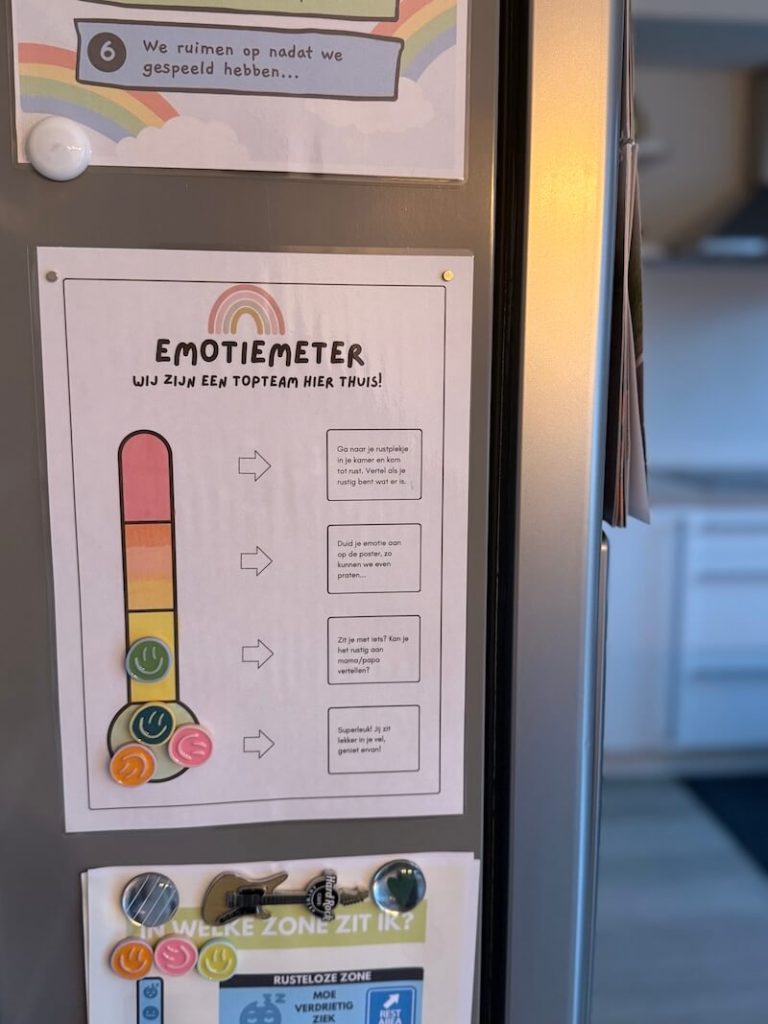 Ik probeerde ook iets nieuws omdat mijn kinderen geen ‘praters’ zijn. Pas na enkele dagen en vervelend gedrag komt er werkelijk uit wat er nu eigenlijk scheelt… Ik dacht dat een gevoelensmeter wel kon helpen. Ik drukte hem af en kleurde het zelf in. Of misschien kunnen de kinderen dit wel doen. Met een wasknijper en hun naam op of een eigen gekozen magneetje kunnen ze dan hun emotie aangeven. Die hangen we ook in het zicht. Daarover later meer als we ermee aan de slag gaan.
